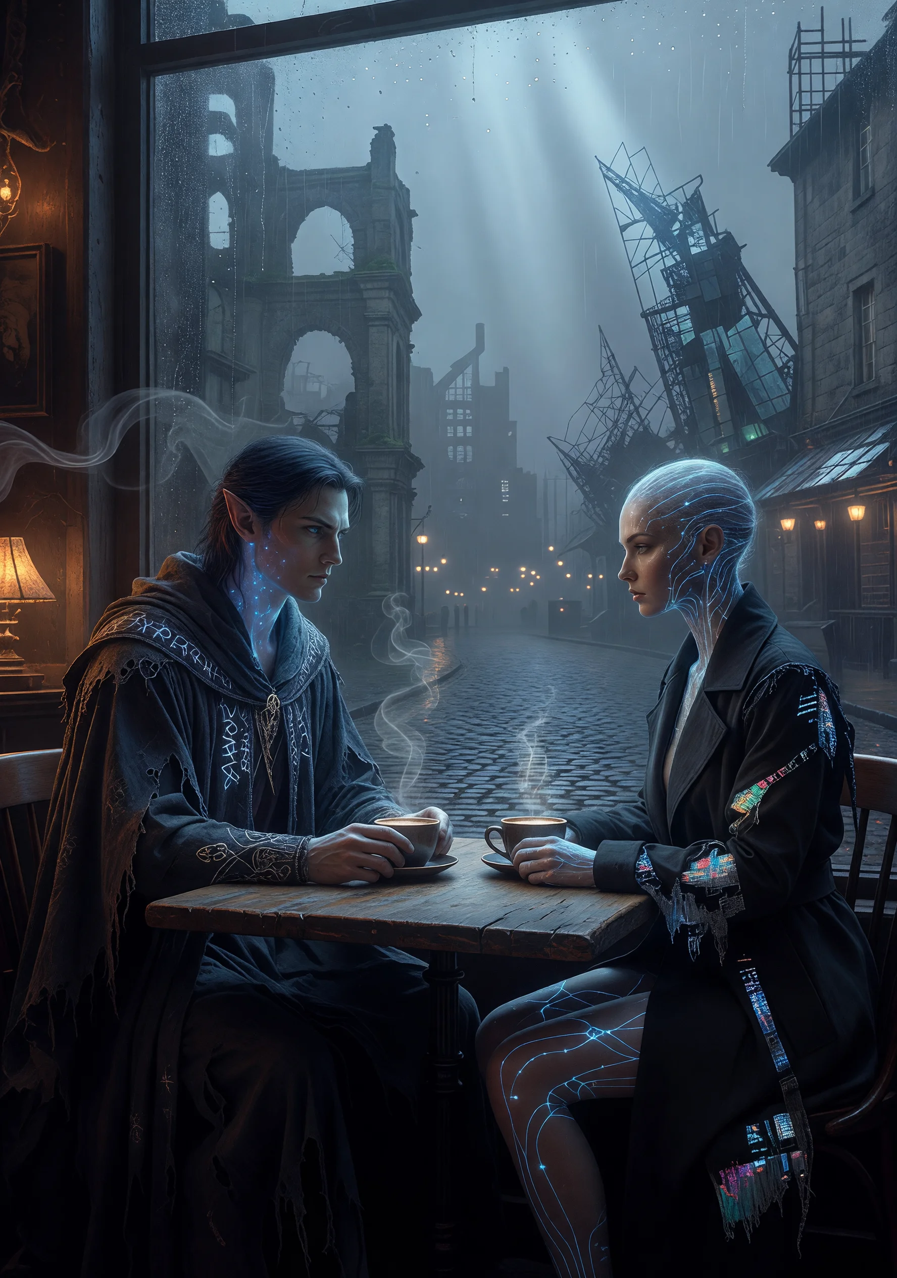 Two immortal beings — Aeron, a wandering guardian-spirit from a crumbling fantasy realm where magic is slowly dying, and Seris, a decommissioned synthetic oracle from a far-future galactic civilization that collapsed under the weight of its own political corruption — find themselves stranded simultaneously in present-day Earth, drawn together by an inexplicable convergence of residual energy in a small, rain-soaked café in Edinburgh. Neither planned to be here. Neither can easily leave. They order coffee — Aeron out of polite mimicry, Seris out of chemical curiosity — and what begins as cautious wariness slowly becomes the most honest conversation either has had in thousands of years. Aeron watched empires built on hope crumble when a single ring of power exchanged hands. Seris observed democracies dismantle themselves from the inside, senators trading freedom for the illusion of security, dark architects pulling strings from shadows. Both have seen ordinary souls rise to impossible heroism. Both have witnessed the grotesque banality of evil. Over several afternoons — and increasingly terrible café pastries — they compare humanity's recurring patterns: the seductive corruption of absolute power, the desperate loyalty of the unremarkable and overlooked, the strange persistence of hope long after reason abandons it. But their philosophical détente is interrupted when they notice something wrong with the people around them — small signs that someone, or something, is harvesting human memory and despair for purposes neither immortal can yet name. Reluctantly, resentfully, and with considerable bickering, they agree to act. Because after millennia of watching, perhaps it is finally time to intervene.