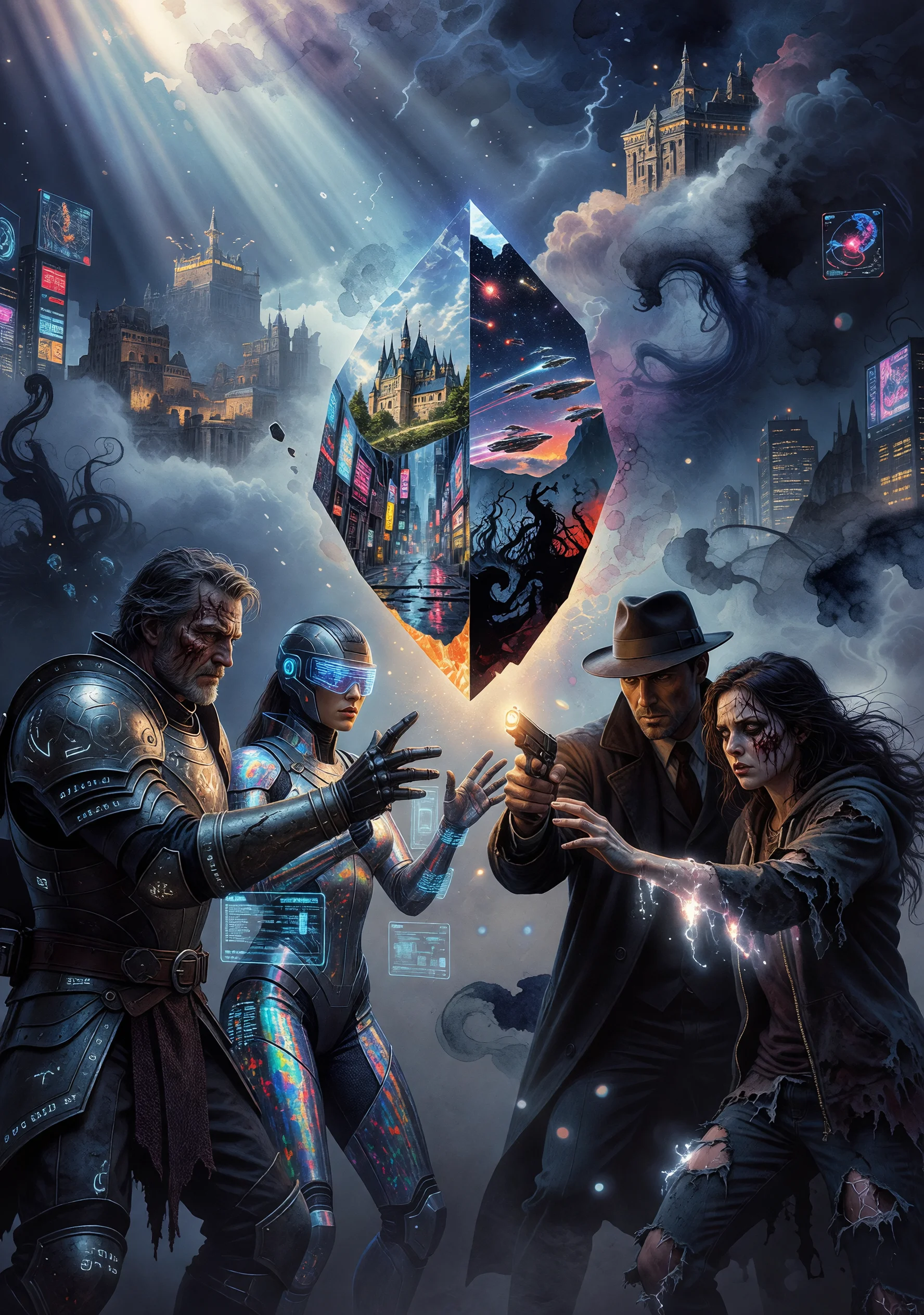 In a realm where realities bleed into one another like watercolors left in rain, four unlikely thieves are conscripted by a dying oracle to steal the Cornerstone — an artifact of impossible existence that simultaneously anchors a fantasy kingdom's magic, powers a galactic empire's hyperspace network, haunts a noir city's criminal underworld, and feeds the nightmare dimension of a horror survivor's waking terrors. The Cornerstone exists in all four realities at once, meaning the heist must be executed in perfect synchrony across worlds that obey entirely different laws. Lira Ashveil is a silver-tongued fantasy thief from a kingdom where starlight can be bartered and promises carry literal weight — she navigates magic through intuition and stolen relics. Jax Corvin is a ghost-network hacker embedded in a fractured galactic republic crumbling under corporate manipulation and shadow-senate corruption, surviving on encrypted data and smuggled code. Maren Holloway is a hard-boiled detective from a rain-soaked city of perpetual midnight, where loyalty is currency and every client lies through cigarette smoke. Desta Vael is the sole survivor of a horror colony that awakened something beneath its soil — she carries trauma like a second skeleton and has learned to weaponize fear itself. Together they must learn that the Cornerstone is not merely stolen — it must be willingly surrendered by each reality's guardian simultaneously. The true heist is not a theft but a seduction of worlds: convincing four entirely different powers to let go of the one thing holding their existence together. As boundaries between realities thin, the team discovers they are not strangers — across every fracture of existence, they have always been searching for each other.