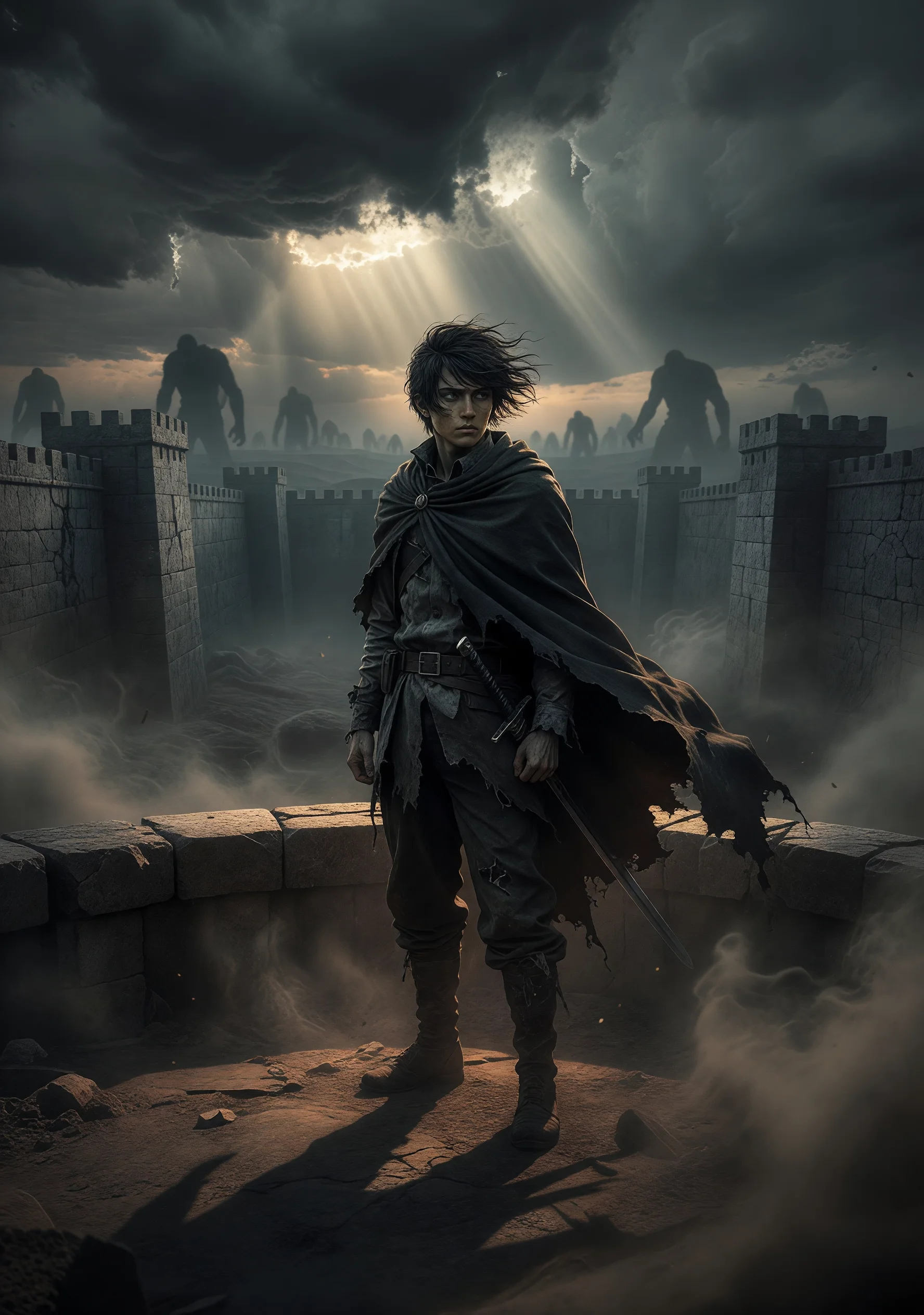 帝都の三重壁に囲まれた世界。壁外には巨人が跋扈し、人類は恐怖と無知の中で世代を重ねてきた。主人公・柊レンは、調査兵団に所属する若き兵士だが、仲間のように「自由への渇望」も「人類への使命感」も持ち合わせていない。ただ、何となく生き延びてきた。何となく剣を握り、何となく訓練をこなし、何となく今日も壁の上に立っている。幼い頃、超大型巨人の侵攻で故郷を失い、母を失った。しかし彼の心に残ったのは復讐の炎ではなく、深い虚無と、自分が「生き残ってしまった」という根拠のない罪悪感だった。兵団の中には輝かしい仲間たちがいる。信念のために死ねる者たち。レンはその眩しさに目を細めながら、彼らを道化師のような愛想笑いで遠ざけ続ける。ある日、壁外調査で始祖の巨人の記憶の断片が彼に流れ込んでくる。それは遠い祖先の孤独と、誰にも理解されなかった少女の叫びだった。記憶の中の少女と、自分の空洞が重なる。救済を求めながら救済を拒み続けた者の物語。巨人の脅威より、自分自身という迷宮に閉じ込められた一人の人間の、静かで痛切な告白録。壁が崩れる日、レンはようやく問う——私は、人間である資格があったのだろうか、と。