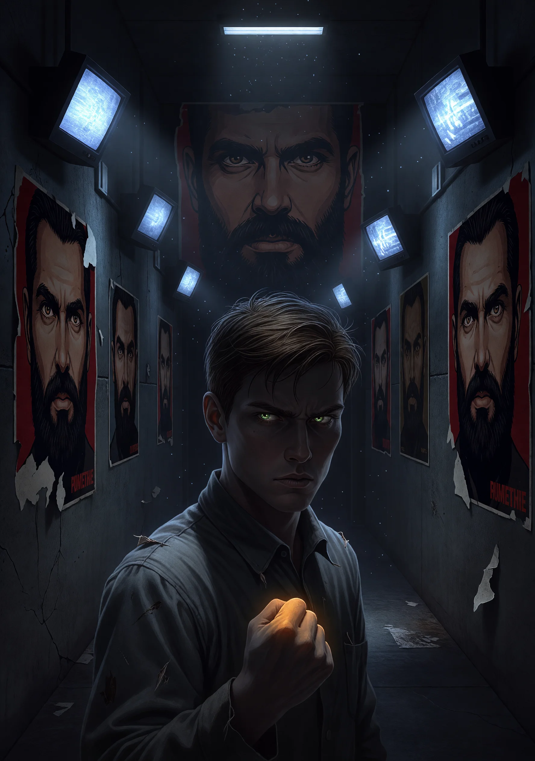 845年、マーレの巨人に母を喰われた少年エレン・イェーガーは、復讐と自由への渇望を胸に調査兵団へ入隊した。しかし始祖の力を解放した瞬間、彼の意識は時空の狭間に飲み込まれ、気がつくと全く異なる世界に転生していた。 大洋国、1984年。ここには三重の壁も巨人もいない。だが代わりに、至る所に黒髭の男の巨大な顔が貼り出されている。「ビッグ・ブラザーはあなたを見ている」と。テレスクリーンは昼夜問わず市民を監視し、思想警察は心の中の反逆さえ嗅ぎつける。壁の代わりは人間の精神そのものに刻まれた恐怖であり、巨人の代わりはオセアニア党という見えない怪物だった。 エレンは外囲党員ウィンストン・スミスとして記憶を持ったまま目覚める。始祖の力も進撃巨人の変身能力も、この世界では機能しない。肉体的な超人性を失った彼が持つのは、かつて壁の外を夢見た絶対的な意志と、未来の記憶の断片のみ。 真理省の薄暗い廊下でジュリアという女性に出会い、奥布莱恩という謎の上位党員に近づくにつれ、エレンは悟る。この世界の「自由」とは逃げるものではなく、内側から解体しなければならないものだと。かつて地鳴らしで世界の八割を踏み潰した少年が、今度は一人の人間の魂として、最も精巧な檻に挑む。だが党は問う――自由を求める心そのものを消し去られたとき、人はまだ人であり続けられるのか?
