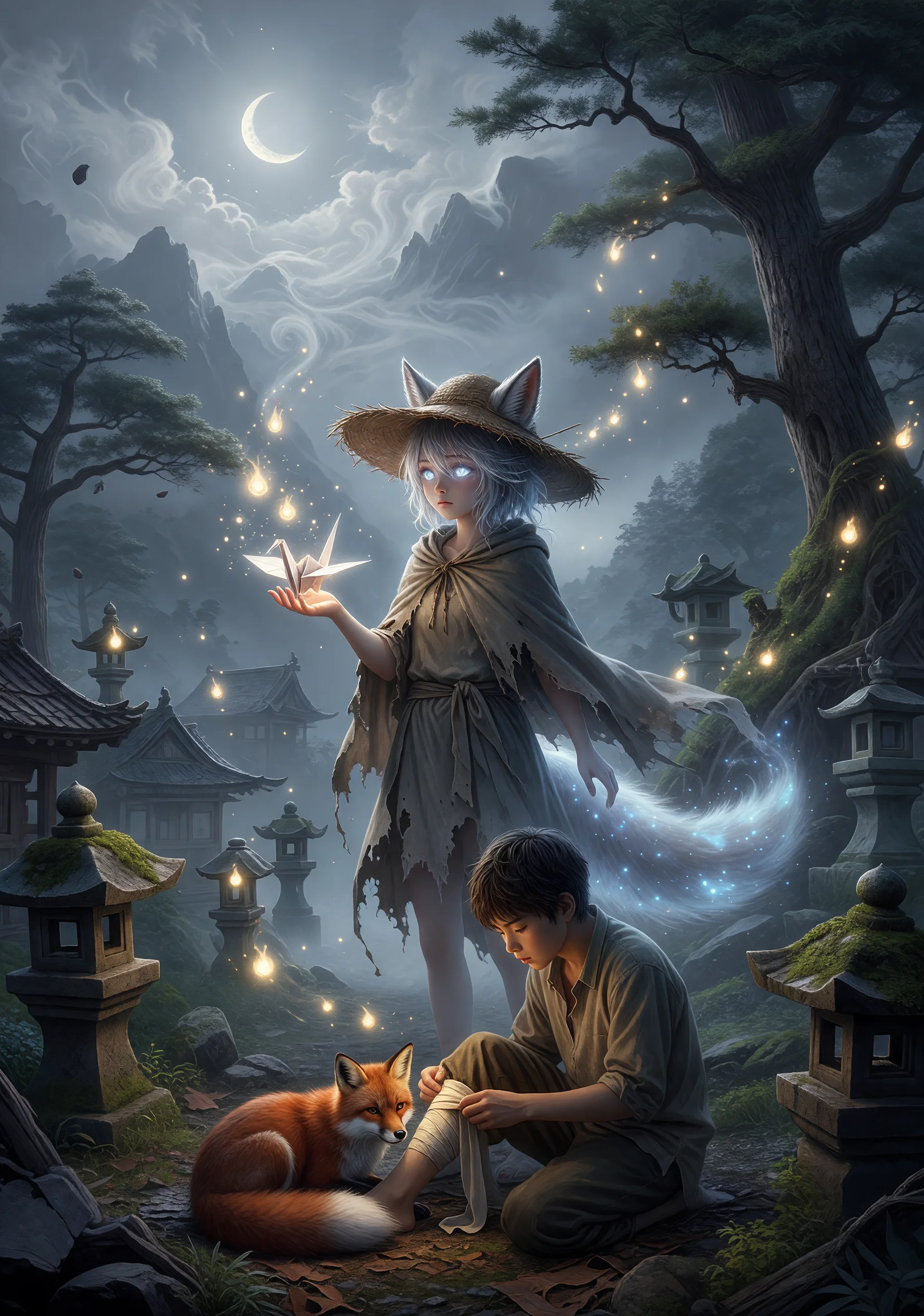 在遙遠的山嶺深處,有一座人們漸漸遺忘的古老村莊。十四歲的少年阿晴因為替生病的祖母採藥,在一場突如其來的山霧中迷了路,誤入了狐族居住的「霧谷」。在那裡,他遇見了一隻渾身沾滿泥濘、被捕獸夾傷了後腿的小狐狸。阿晴替牠包紮傷口,沒想到隔天清晨,受傷的狐狸變成了一個與他年紀相仿、耳朵和尾巴藏在草帽與披風裡的女孩——小燈。小燈的眼睛像盛著月光的水窪,對世間萬物都感到好奇而雀躍,卻對人類的村落充滿恐懼。兩人悄悄約定,阿晴每隔三日便帶一份祖母做的甜糕來到山腳的老柿樹下,小燈則用狐族的靈力幫助村莊的農田驅散蟲害、引來雨水。然而,村裡老獵人發現農田奇異地豐收,開始懷疑山中有妖物,帶人上山設下陷阱。阿晴必須在揭露秘密與守護友誼之間做出抉擇。最終,小燈召來了整座山嶺的狐火,將那些冰冷的鐵夾化為盛開的野花,也讓村民第一次看見了山靈的善意——那不是妖,而是比人更早愛著這片土地的靈魂。