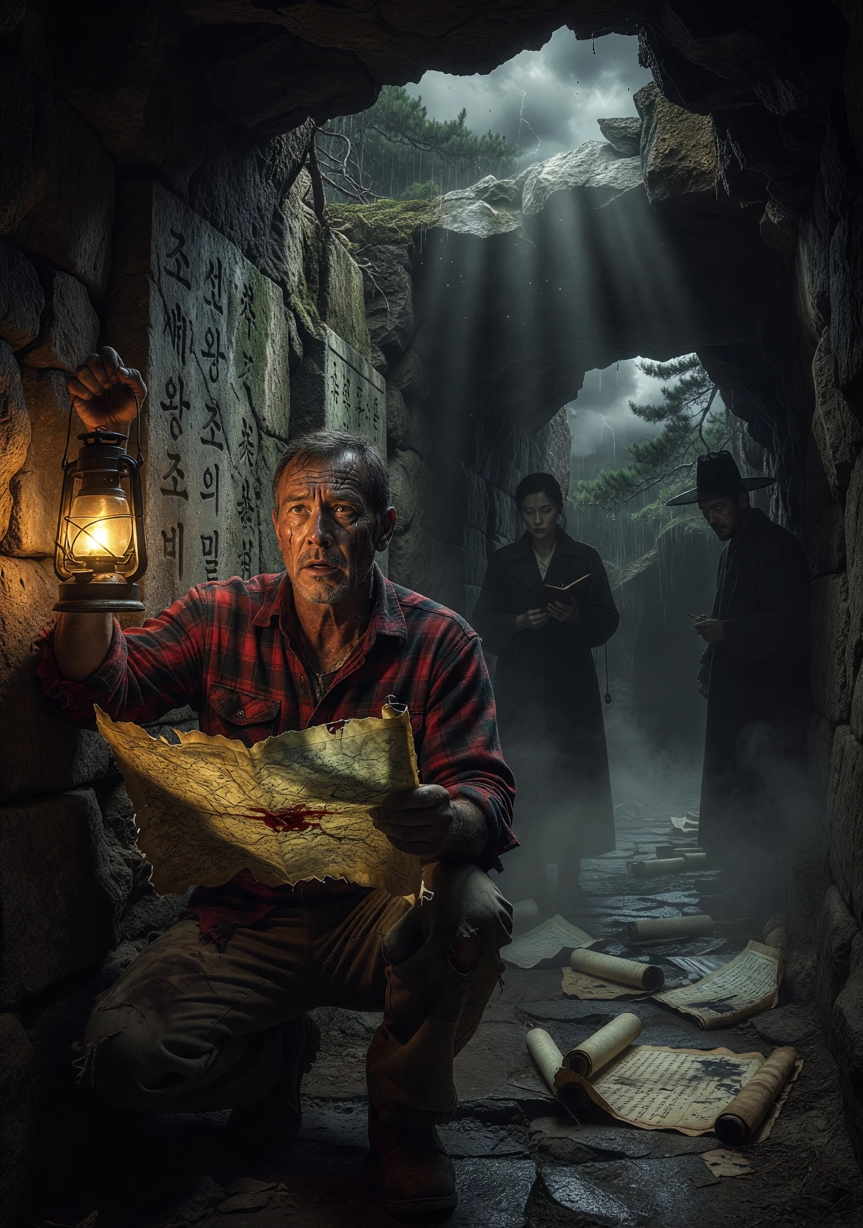 1990년대 말, IMF 외환위기의 파고가 한반도를 삼키던 시절. 전직 광부 출신의 도굴꾼 강무열은 빚더미에 올라앉은 채 마지막 한탕을 꿈꾼다. 그의 손에 들어온 것은 낡은 비단 지도 한 장—조선 중기 왕실의 비밀 능침으로 추정되는 곳의 위치가 적힌 것이다. 무열은 풍수지리에 능통한 사기꾼 오달수, 문화재 감정사 출신의 냉혹한 여자 서진아를 끌어들여 강원도 오지의 깊은 산속으로 향한다. 그러나 그들이 파헤친 무덤 안에서 발견한 것은 황금이 아니었다. 수백 년간 봉인된 기록들—국가가 지우려 했던 역사의 진실과, 그 진실을 지금도 은폐하려는 살아있는 자들의 그림자였다. 산 아래에서 누군가가 그들을 미행하고 있었다. 국정원 출신의 사내, 문화재 브로커, 그리고 무열 자신의 과거에서 기어나온 어떤 얼굴. 땅굴이 좁아질수록 인간들 사이의 신뢰는 무너지고, 탐욕은 짐승의 얼굴을 드러낸다. 가장 깊은 어둠 속에서 무열은 깨닫는다—진짜 무덤은 땅속에 있지 않다. 그것은 살아있는 인간들이 서로를 향해 파놓은 구덩이다.