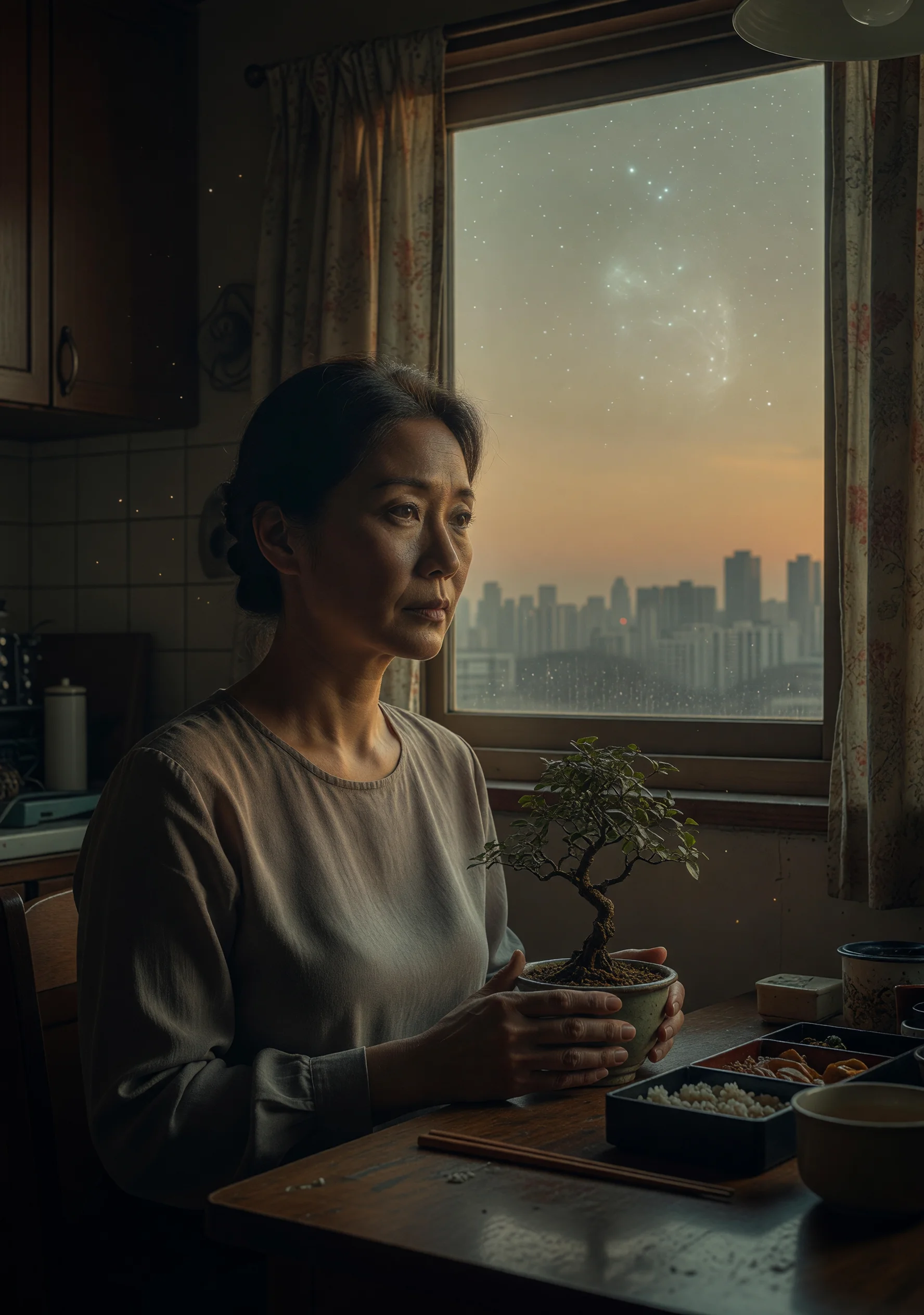 2031년, 지구는 이미 외계 문명 '보이지 않는 자들'의 존재를 알고 있다. 그들이 보낸 신호는 해독되었고, 400년 후 함대가 도착한다는 사실도 공식 발표되었다. 하지만 서울 마포구의 한 작은 아파트에서 중학교 국어 교사로 살아가는 윤세아에게 그 소식은 여전히 실감 나지 않는다. 그녀는 여전히 월요일 아침마다 도시락을 싸고, 학교 복도에서 동료 교사 강민준과 어색한 인사를 나누며, 퇴근 후에는 오래된 분재에 물을 준다. 세아의 어머니는 치매가 깊어지면서 외계 침공 뉴스와 40년 전 기억을 혼동하기 시작하고, 세아는 그 혼란 속에서 오히려 어머니의 과거를 처음으로 이해하게 된다. 학교에서는 아이들이 '어차피 우리 세대는 아니잖아요'라며 무기력하게 웃고, 세아는 그 웃음이 자신의 것이기도 하다는 걸 안다. 강민준은 어느 날 세아에게 조용히 고백한다—자신은 외계 신호 해독 프로젝트에 참여했던 물리학자였다고. 두 사람은 우주의 끝과 부엌 창문 사이 어딘가에서 서로를 발견해간다. 종말의 예고가 일상을 파괴하지 못하는 이유, 그리고 그럼에도 불구하고 인간이 서로를 향해 손을 내미는 방식에 대한 이야기.