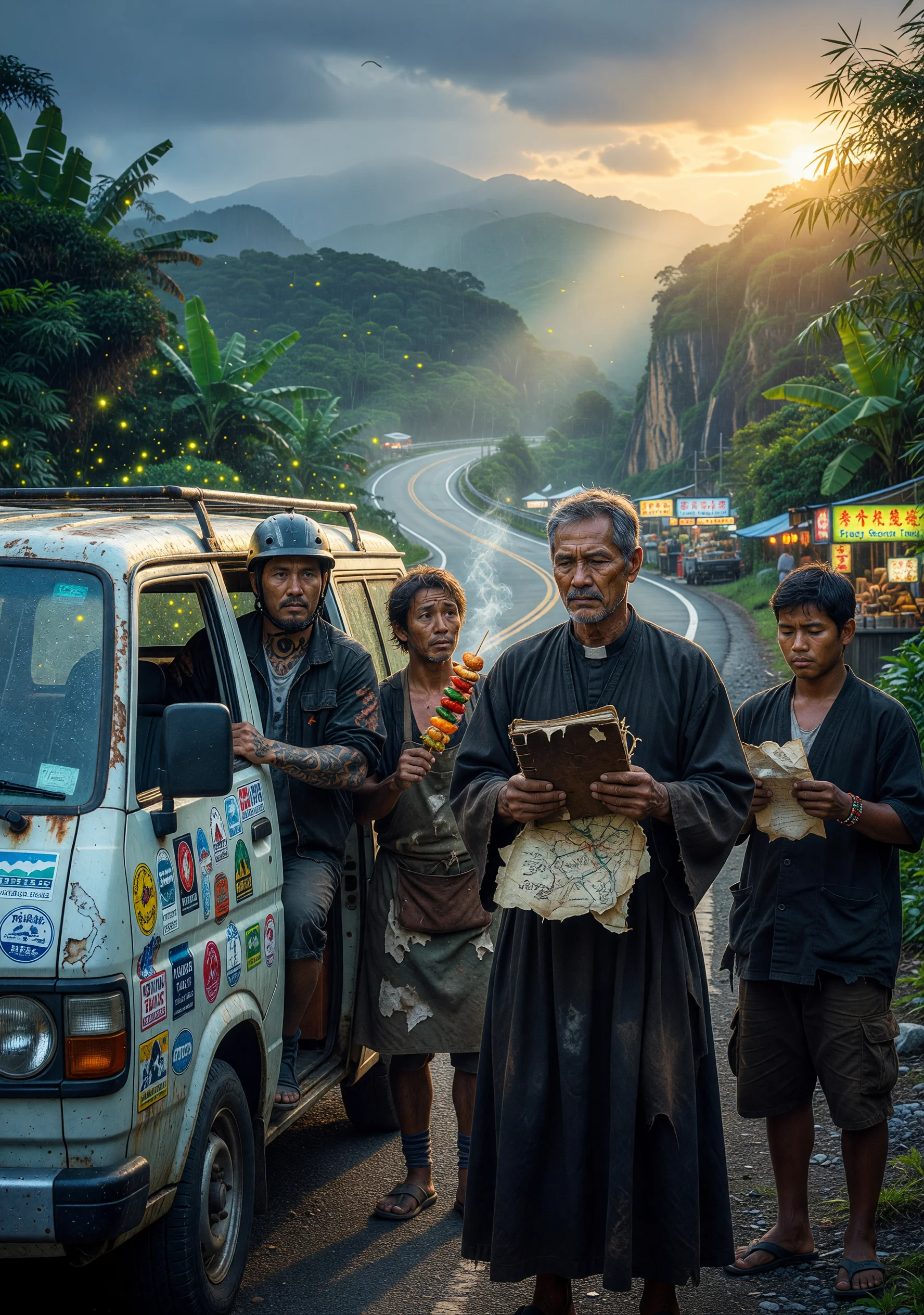 盛夏的台北,一輛貼滿褪色貼紙的老舊廂型車停在火車站前。唐玄,一位誤把地圖看反的中年神父,手持一本破舊筆記本,執意要在四十天內完成環島朝聖,只為尋找他年輕時在花蓮寫下卻從未完成的那篇布道詞。車子發動的瞬間,卻意外夾帶了三個不速之客:孫悟,一個剛被便利商店辭退、渾身刺青、嘴巴沒有把門的外送員,五年前因一場衝動毀掉了自己的格鬥夢;朱八,一個負債累累的直播美食主播,每到一個地方就先找吃的,口口聲聲要「創業東山再起」卻永遠原地踏步;沙靜,一個幾乎不說話的原住民青年,揣著一封始終沒有寄出的信,要回到台東見一個他虧欠多年的人。四人毫無默契,在蘇花公路的大雨中爆發第一次衝突,在台南廟口的夜市重新凝聚,在墾丁的星空下各自吐露心事。真正的妖魔不是路上的障礙,而是每個人心裡那個沒有和解的自己。環島的終點,或許才是出發的真正起點。