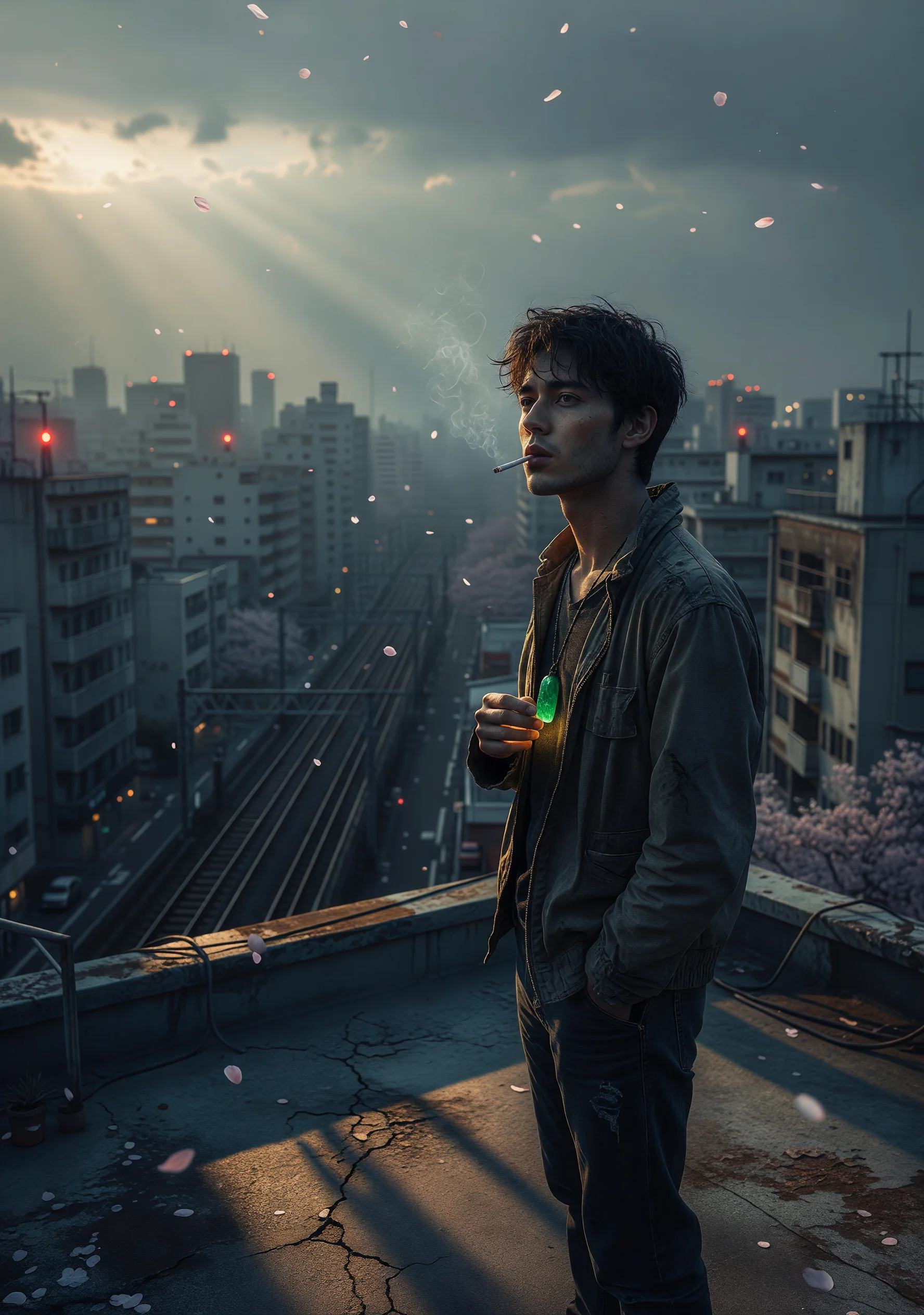 賈維玉是東京某間不知名大學的大三生,住在目黑區一棟老舊公寓樓的204號房。他不清楚自己在讀什麼系,也不清楚自己為何在這座城市,只知道脖子上掛著祖母留下的一塊翡翠墜子,有時候它會在夜裡微微發熱。 他認識兩個女人。黛子,是他中學時代便認識的舊友,說話永遠輕聲細語,走路像是怕驚醒地板裡沉睡的什麼。她在神奈川的療養設施住了將近一年,每隔幾週寄來手寫明信片,字跡細如蜘蛛腳,內容只是描述窗外的雲或者早餐的顏色。維玉每次讀完都會站在陽台上抽一根菸,望著遠處不知哪棟大樓頂上的紅色警示燈,一閃一滅。 寶香則完全不同。她在便利商店打工,永遠穿著同一件灰色連帽衫,對什麼事情都有話說,笑起來像是不怕任何代價。她說維玉是她見過最奇怪的人,因為他喝酒的時候看起來比清醒時更清醒。 故事在兩個女人之間緩慢展開,伴隨著公寓頂樓的廢棄天台、深夜的山手線、以及那塊墜子始終無法解釋的溫度。直到某個梅雨季節的清晨,維玉接到一通電話,才發現有些人的消失是沒有預兆的,而有些東西一旦碎掉,就連碎片都找不回來。