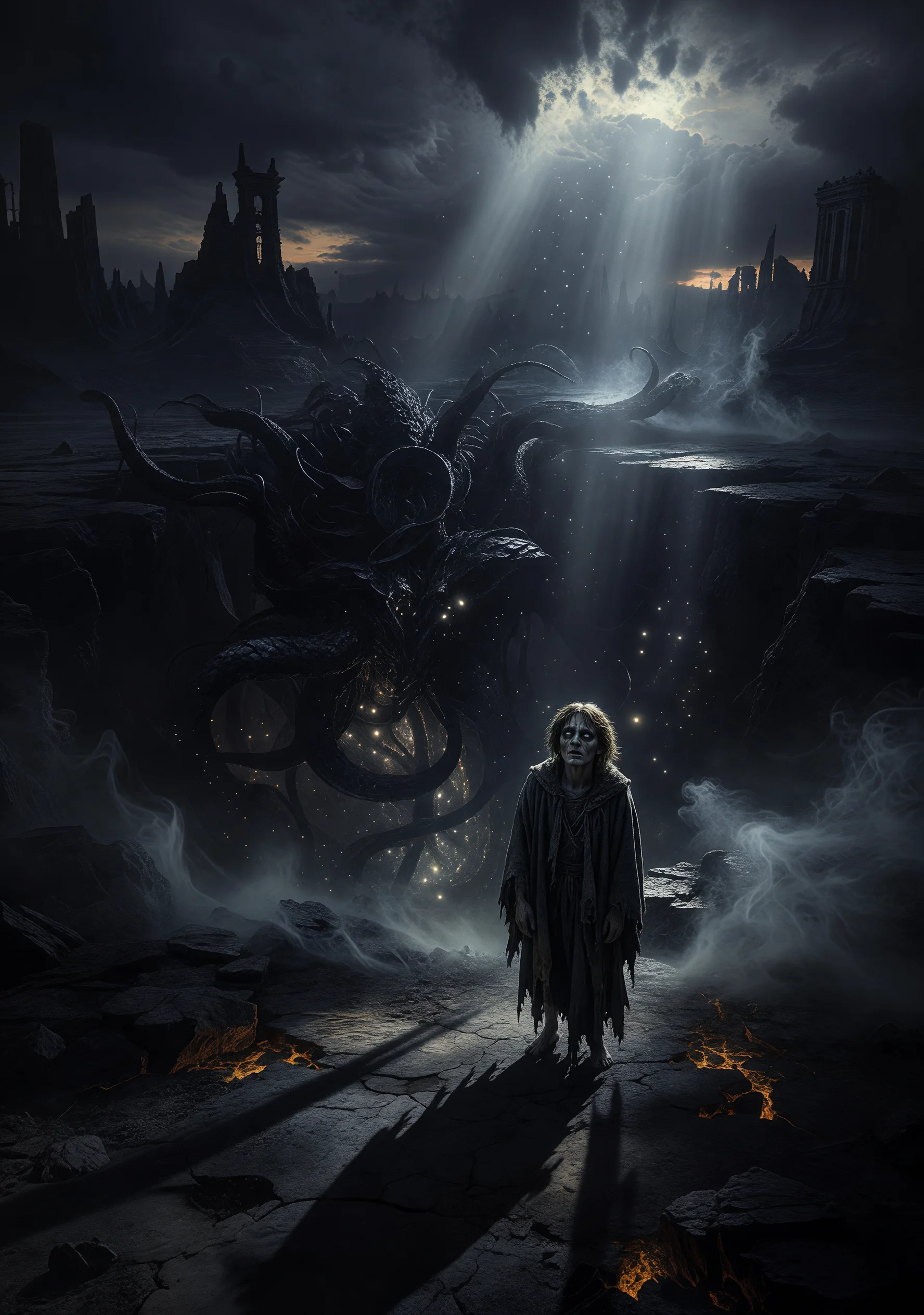 In the world of Andurath, a land men call ancient and holy, the great powers known as the Valar are not benevolent divine architects but merely the surface tremors of something immeasurably older — colossal entities of no name and no mercy, sleeping in the deepest strata of the earth, dreaming the world into fragile, temporary existence. The hobbits of the Mirelands are not quaint rustic folk but rather beings of peculiarly thin consciousness, poorly insulated against the whispers that bleed upward through stone and root. This thinness is precisely why Bilbo Greyfoot discovers the Ring in the dark of Morloch's Pit — it was never lost. It was waiting for a mind with walls too weak to refuse it. Frodo Greyfoot inherits not a weapon of power but an invitation. As he carries the Ring eastward toward the volcano called the Maw of the Sleeper, he does not feel corruption. He feels awakening — a slow, oceanic expansion of perception, the membrane between his consciousness and something boundless growing thinner with each mile. His companions — the ranger Arathas, the elf Calandris, the dwarf Thordun, the soldier Borvane — each begin to perceive it too: wrongness seeping from the landscape, ancient geometries beneath ruins, stars that rearrange when no one watches steadily. The Fellowship does not merely quest to destroy a weapon. They descend, layer by layer, into the realization that Andurath was never theirs, that the beauty of elvish cities and the solidity of dwarven halls are thin films stretched over a breathing, patient, incomprehensible darkness. The dark lord Auranthas is not a conqueror. He was the first man to fully wake up — and what looked back at him through that opening unmade him entirely. The horror of the novel is not destruction but revelation. Frodo reaches the Maw not to save the world but because the thing beneath it has been calling him home. The Ring does not fall. Frodo opens his eyes.