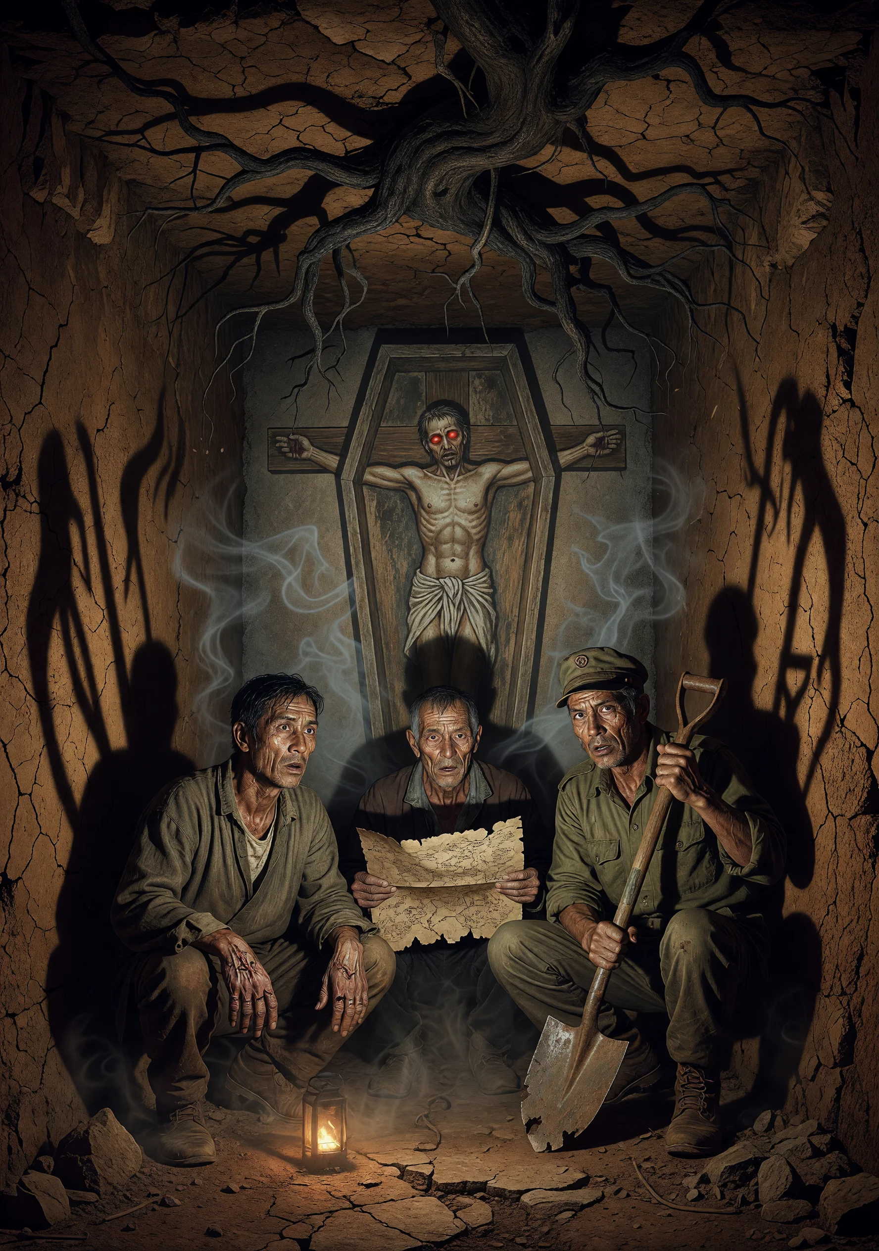 山东高密县红泥洼村,三个庄稼汉——哑巴二顺、赌鬼孙老歪、退伍兵曹铁锤——因为一场百年难遇的旱灾挖出了地下的秘密。村口那棵被雷劈成两半却仍然活着的老槐树,据说根系扎进了一座被遗忘的明代千户将军墓。三人循着一本残缺的《阴宅图录》下墓寻宝,却一步步踏进了死者编织的陷阱。墓道里漫着腐土的腥甜气息,壁画上画着一个被钉在棺材板内侧、睁着眼睛的男人,而那双眼睛的位置随着他们走动而转动。盲人说唱人赵瘸嘴在村头的戏台上唱着这件事的前因后果,他的唱词比三人的脚步早一步,总是提前唱出他们尚未遭遇的灾祸。官方勘探队进村丈量土地的公文与三人地下的挣扎交错呈现,土地兼并的现实压迫与地下死者的怨念相互缠绕。二顺的耳朵开始听见泥土说话,孙老歪的手掌长出了与墓主画像一模一样的掌纹,曹铁锤则在睡梦中反复走回昆仑山的雪地。三人最终在第九道石门前分裂,各自面对土地给予人的最古老的惩罚与馈赠,而赵瘸嘴的唱词在这一夜戛然而止。