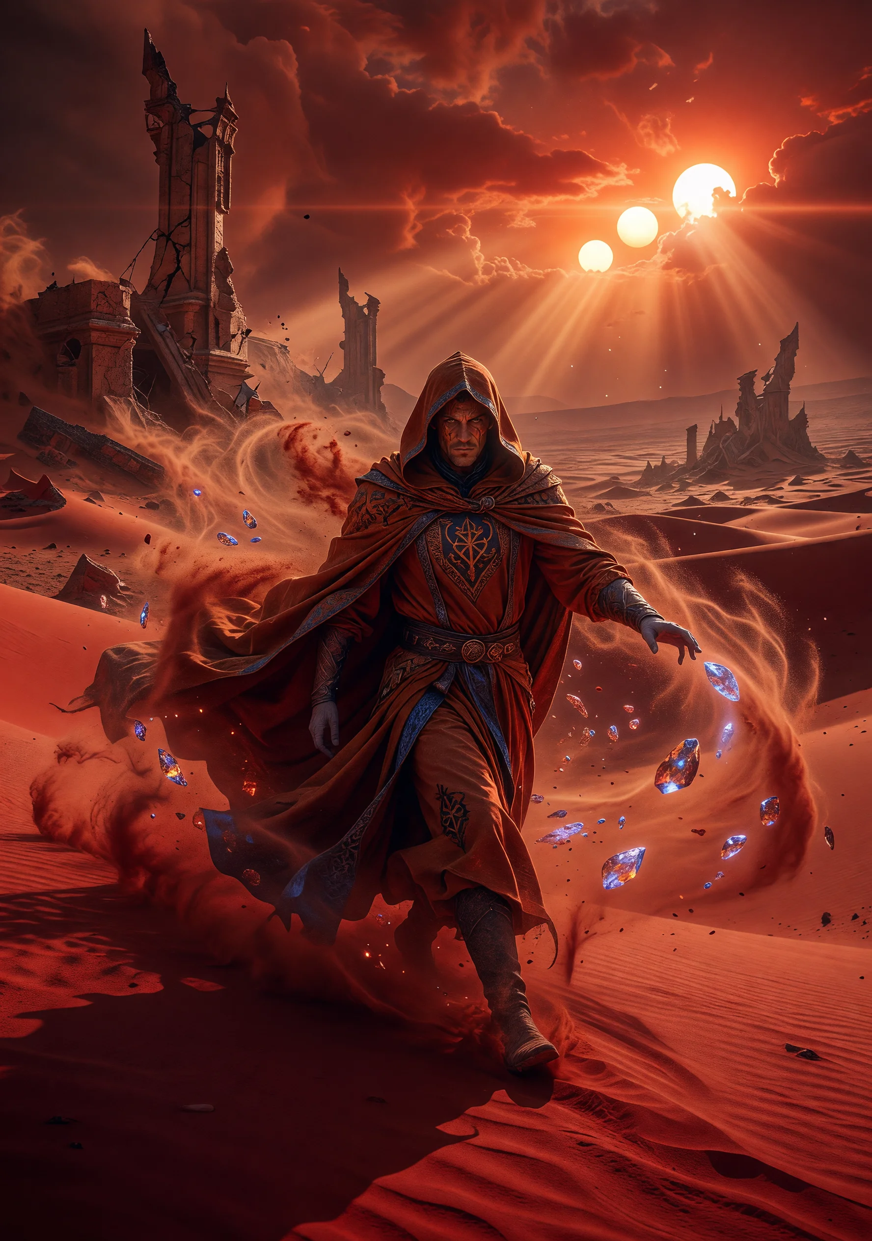 In a galaxy ruled by the iron fist of Emperor Valdris IV, the noble House Kaelen has governed the ocean world of Serenne for generations. When the Emperor commands Lord Edric Kaelen to relocate his family to the desert planet Durath — the sole source of the universe's most coveted substance, Ashspice — it seems like an elevation of privilege. But Durath is a wound in the cosmos, a place where the heat itself feels like punishment and the silence is the silence of graves. Ashspice does not extend life or fuel starships cleanly. It does something far worse: it opens the mind to every conceivable version of one's own death. Thousands of them. Simultaneously. Edric is murdered within weeks of arrival, betrayed by the rival House Vorn and the Emperor's whispered complicity. His sixteen-year-old son, Cael Kaelen, and his mother, Lady Maren — a trained adept of the Sisterhood of Verath, skilled in voice-manipulation and body discipline — flee into the deep desert. There they are taken in by the Rashen, the indigenous desert people who have endured Ashspice their entire lives by developing rituals of willful forgetting. Cael, however, cannot forget. His exposure to Ashspice was too sudden, too total. The visions do not come in orderly prophecy — they come as an avalanche of screaming futures, each one ending in his own ruin. He watches himself burn. Drown. Suffocate. He watches his mother kneel in the sand over something unrecognizable. He watches himself become a tyrant. The desert is not simply hostile terrain; it is a psychological engine designed by nature to break the human mind. As Cael is hailed by whispered Rashen prophecy as a messianic figure — the Ashen Voice, a leader who sees all ends and yet still chooses — he must decide whether the visions are a gift, a curse, or the slow architecture of madness. He organizes rebellion against House Vorn. But every tactical victory peels back another layer of his sanity. The novel explores whether a man consumed by every possible death can still choose how to live.