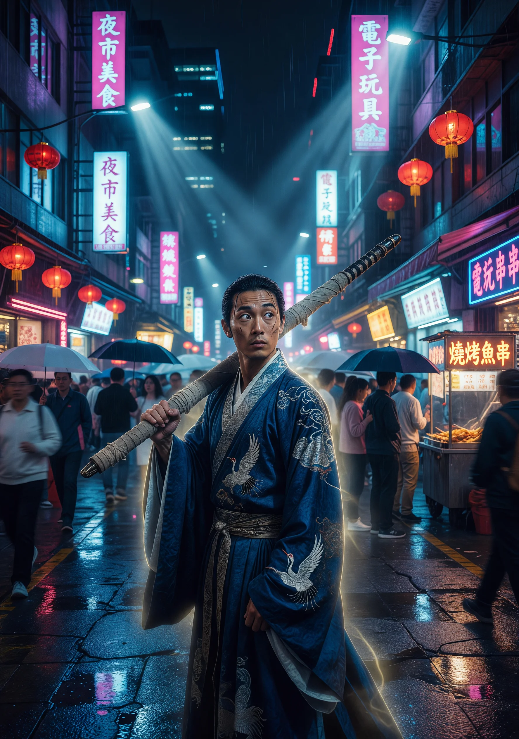 令狐冲在与任盈盈归隐后,一次偶遇神秘石碑,竟莫名穿越到二十一世纪的台北西门町。放眼望去,霓虹灯影与人潮涌动取代了青山竹林,令狐冲怀抱装剑的长布包,茫然立于街头,却浑然不觉此处已是另一个时代。他以随遇而安的性情迅速适应都市生活,先在西门町红楼附近摆起小摊,凭借独门卤味秘方(实为江湖行走时从各地厨子处习得的手艺)养活自己。然而西门町帮派林立,地头蛇「赤刀会」垄断摊贩保护费,令狐冲初次遭遇收费时,以独孤九剑「破刀式」徒手卸掉对方西瓜刀,引发轰动。消息传开,他意外成为西门町街头弱势摊贩的守护者,并与一名身世神秘、表面经营精品店却实为调查黑金洗钱的女刑警秦笙结下忘年之交。令狐冲用江湖眼光看穿都市权贵伪善面具,用独孤九剑的「无招胜有招」化解一次次危机,也逐渐明白:无论古今,人心争斗从未停歇,唯有洒脱自在,方能笑傲任何江湖。最终他帮助秦笙瓦解幕后财团阴谋,自己也在台北寻得一份归属,将卤味摊升级为人气小馆,笑傲于这座钢铁丛林之中。
