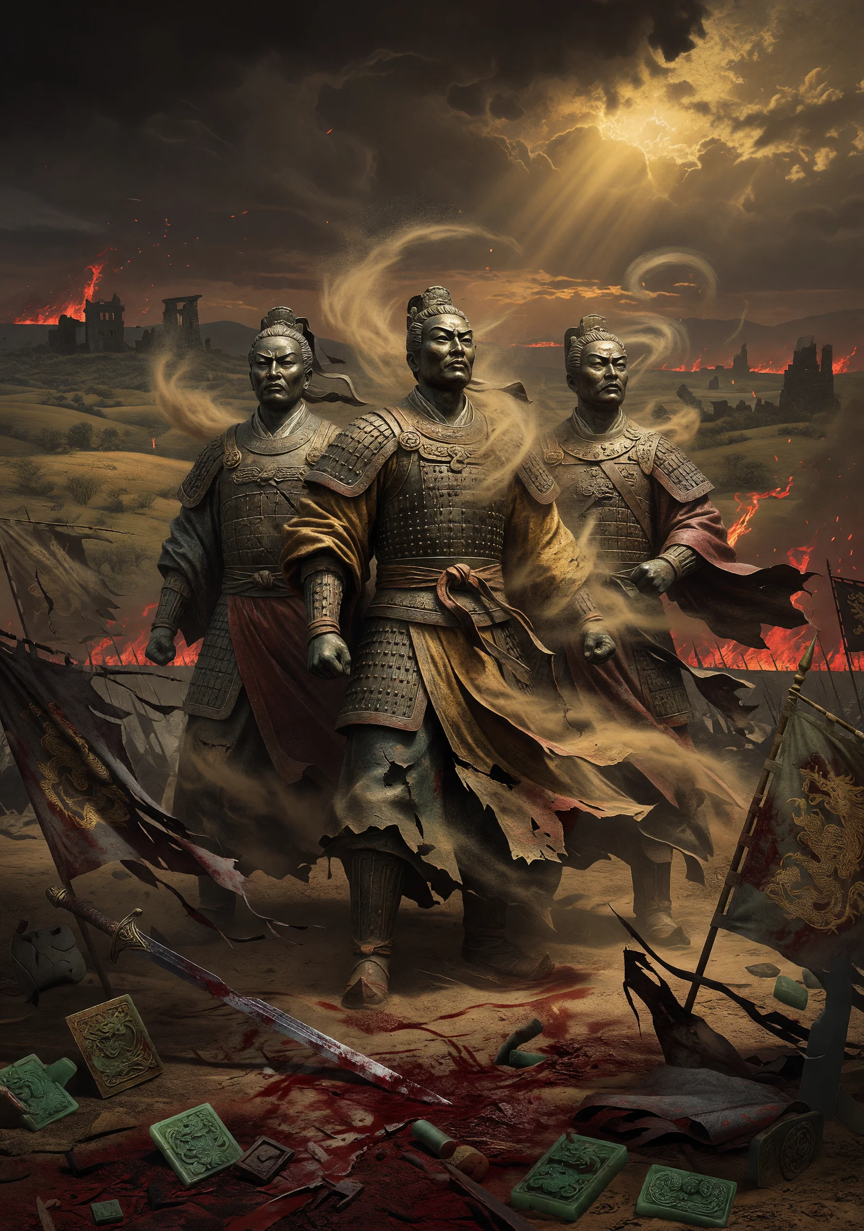 後漢末期、黄巾の乱が大地を揺るがした時代。民は飢え、朝廷は腐り、各地に野心を抱く者たちが割拠し始めた。本作は、曹操・劉備・孫権という三人の傑物が天下を争った百年の動乱を、司馬遼太郎的俯瞰の視点で描く歴史長篇である。主人公は特定の英雄ではなく、「時代そのもの」である。曹操は冷徹な現実主義者として描かれ、乱世を終わらせるためならば仁義すら道具として用いる男として分析される。劉備は「仁」の旗印の下に人を集めながら、その旗印ゆえに時代の波に翻弄される矛盾した指導者として描かれる。孫権は父兄の遺産を守る守成の君として、江東の地に独自の論理を構築する。諸葛亮は天才的謀略家である以前に、滅びゆく蜀という国家の荷を一身に背負った悲劇の行政官として描写される。赤壁の炎、荊州の喪失、夷陵の惨敗、祁山への六度の北伐――これらの事件は、英雄の偉業としてではなく、歴史の必然が個人の意志を押し潰していく過程として冷静に活写される。最終的に三国は司馬氏に統一されるが、作者はその結末に勝者の栄光ではなく、英雄たちの夢が砂となって散る虚無と、それでも人が志に殉じることの崇高さを見出す。乱世とは何か、英雄とは何か、権力とは何か――本作はその問いを、歴史の細部に宿らせながら問い続ける。