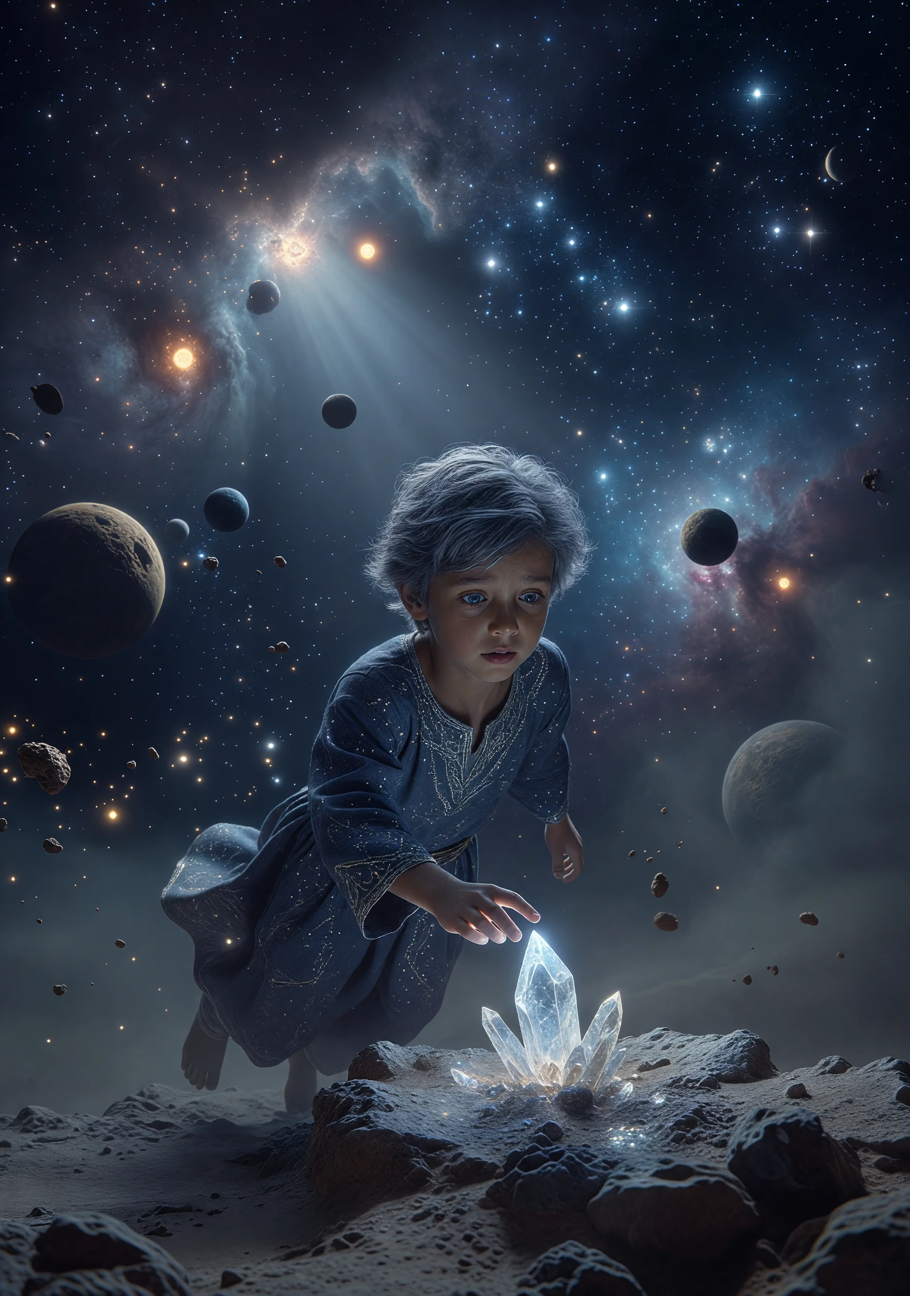 Dans un système solaire au bord de l'extinction, où les soleils s'éteignent un à un comme des bougies oubliées, un petit prince nommé Élian quitte son astéroïde K-7 — une pierre minuscule ornée d'un unique cristal de glace qu'il aime tendrement — pour voyager de planète en planète à la recherche de quelqu'un qui sache encore comment sauver la lumière. Car Élian a entendu une rumeur portée par le vent cosmique : quelque part, parmi les adultes qui peuplent les planètes mourantes, se cache la réponse à une équation impossible — comment traverser le temps pour ramener ce qui a été perdu. Au cours de son voyage, il rencontre une scientifique qui calcule l'infini sans jamais lever les yeux vers les étoiles, un père qui a oublié le visage de sa fille dans les colonnes de chiffres, une architecte qui construit des vaisseaux vers ailleurs sans savoir pourquoi elle fuit, un philosophe qui nomme les trous noirs sans comprendre qu'il vit au fond de l'un d'eux, et un vieux gardien de phare stellaire qui attend un signal qui ne viendra jamais. Chaque adulte a sacrifié l'essentiel sur l'autel de la survie et de la raison. Élian, lui, comprend progressivement que traverser la gravité du temps n'est pas une question de physique, mais d'amour — un amour si précis, si patient, qu'il devient la seule force capable de plier l'espace. Finalement, dans le silence d'un trou noir qu'il traverse sans crainte, Élian découvre que les messages les plus importants ne voyagent pas à la vitesse de la lumière, mais à celle du cœur.