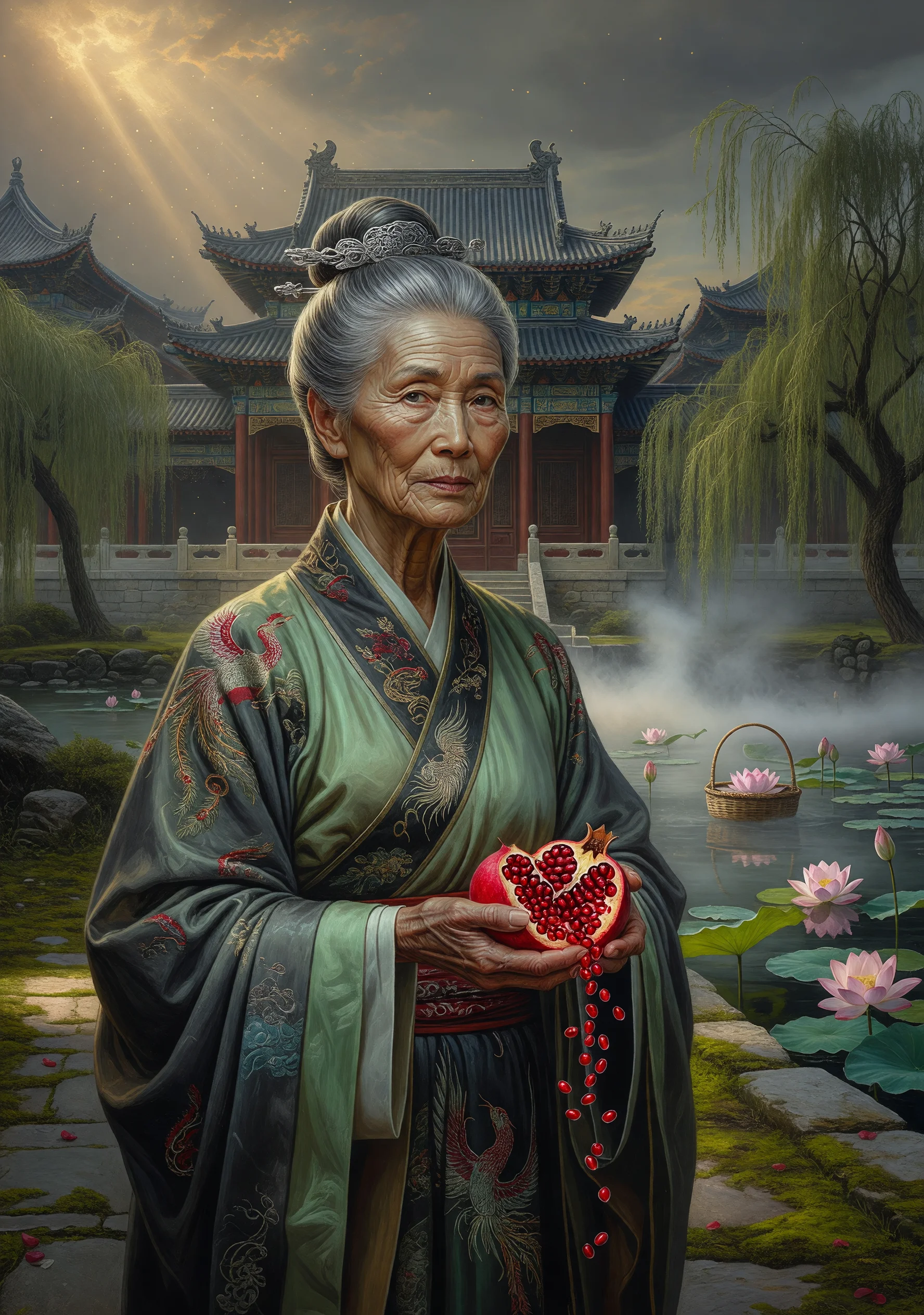 En la ciudad imperial de Luoyang, durante el esplendor decadente de la dinastía Qing, la familia Jia gobierna desde su palacio de jardines interminables como si el tiempo les perteneciera. Pero es Abuela Fénix —matriarca de noventa años que habla con los muertos y lee el futuro en las semillas de granada— quien verdaderamente sostiene los cimientos de ese mundo. La saga comienza cuando una niña sin nombre aparece flotando en una cesta de mimbre en el estanque de los lotos: la familia la bautiza Piedra de Jade y la cría como una más entre las docenas de primas, concubinas y criadas que habitan el laberinto de patios interiores. Piedra de Jade crece adorando a su primo Tianlong, un joven poeta que rechaza los exámenes imperiales y prefiere dormir entre jazmines. Ella es intensa, frágil y visionaria; él es hermoso e incapaz de elegir. Entre ambos orbita Dorada, sobrina llegada de la provincia con modales de seda y ambiciones de acero, portadora de un medallón de oro que, según la superstición doméstica, estaba destinado a unirse con el jade del muchacho. Las mujeres de esta historia —la concubina envenenadora, la administradora implacable, la criada que ama en silencio, la poetisa que quema sus versos— son quienes realmente mueven los hilos del palacio. Son ellas quienes conspiran, perdonan, destruyen y recuerdan. Cuando el Imperio comienza a tambalearse y los inspectores del Trono ordenan el registro del palacio, todos los secretos enterrados bajo los pisos de mármol suben a la superficie como raíces que rompen la piedra. Tianlong perderá a Piedra de Jade en la misma noche en que el palacio sea saqueado. Ella morirá quemando sus poemas. Él sobrevivirá sin saber qué hacer con la libertad.