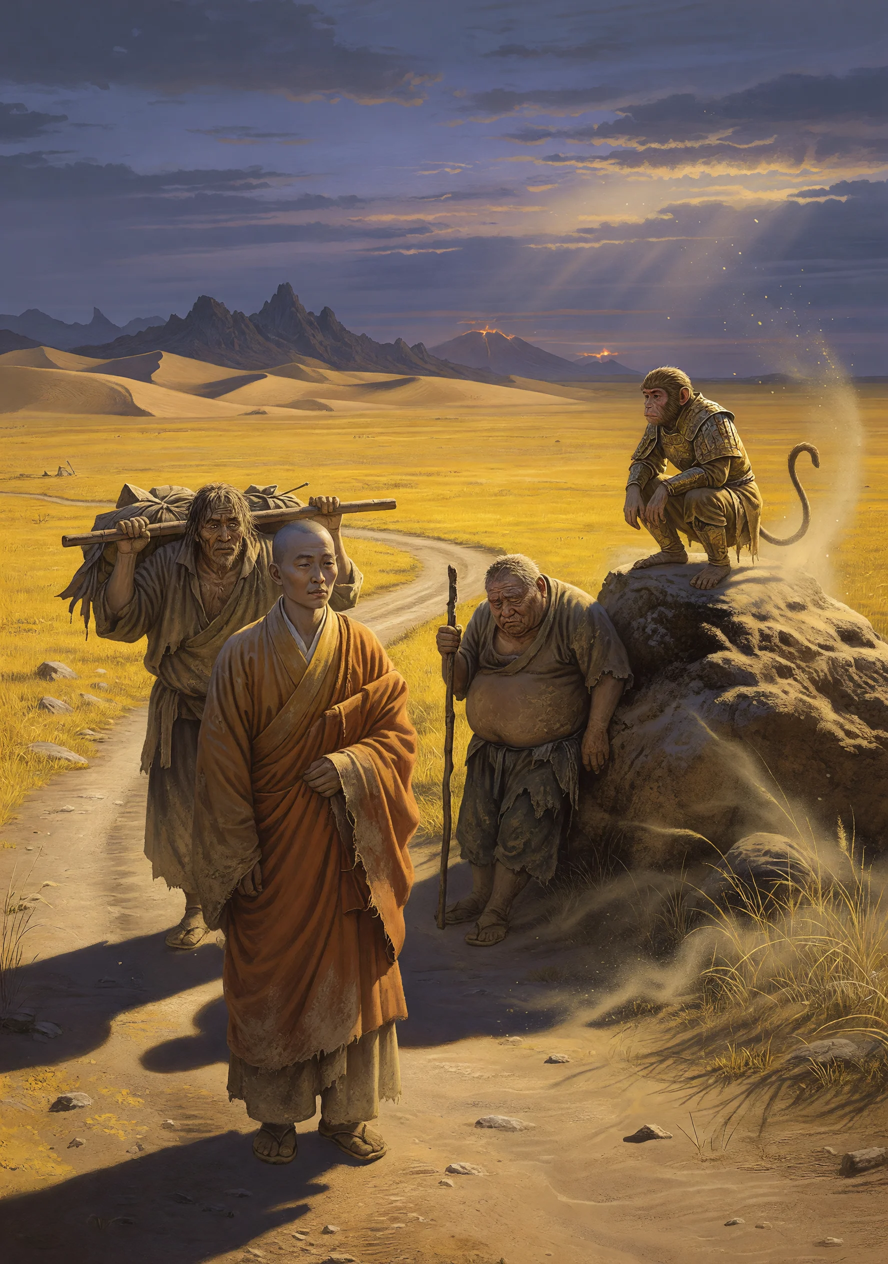 故事發生在一個沒有神佛、只有塵土與歲月的世界。玄奘是一個沉默的僧人,獨自走在通往西域的黃土官道上,後來在流沙河邊遇見了沙和尚——一個已不記得自己罪行的廢人,只懂得挑擔。之後在山野村落撿回了八戒,一個胖大、愛睡、對人世存留最後一點貪戀的男人。孫悟空是最後加入的,他不是被壓在山下,而是蹲在一塊巨石頂端發呆了不知多少年,無人知道他在等什麼。四人便這樣走在一起,沒有使命感,沒有慷慨激昂。他們穿越流沙、黃風、火山、雪嶺。妖怪存在,但更多時候是沉默地對峙,最後各自散去。孫悟空偶爾打架,偶爾獨自走到很遠的地方,站在山頭往回望。玄奘不問原因。真經存不存在從不是核心——核心是這四個各自破碎的人,在漫長移動中,偶爾抬頭,看見同一片天色,然後繼續走。故事沒有大結局,只有某個傍晚,他們坐在渡口等船,誰也沒有說話,夕光把四個人的影子拉得很長,重疊在一起。