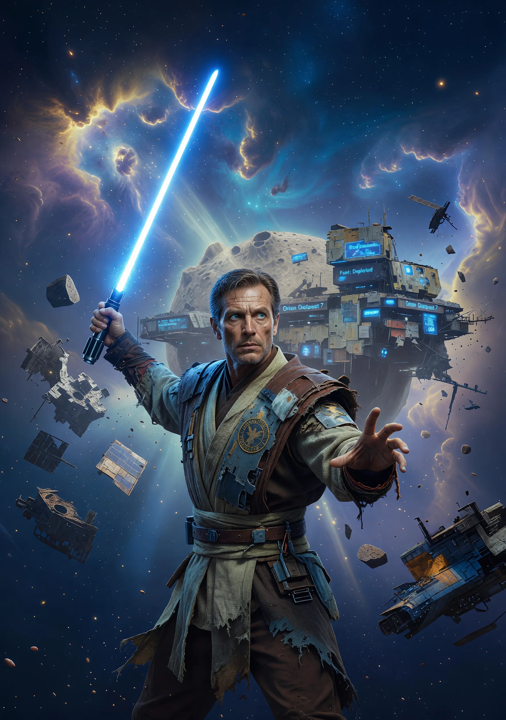 En los confines olvidados del Brazo de Orión, vive Alonso Quijano de la Galaxia, un hidalgo venido a menos que habita en una estación de combustible destartalada en el borde del sistema Manchega. Consumido por la lectura compulsiva de antiguos holocrones jedis, crónicas de la República Dorada y tratados de caballería espacial, el buen Alonso pierde el juicio y se convence de que él mismo es un Caballero Jedi, último guardián de la Fuerza en una galaxia que hace siglos olvidó su existencia. Se rebautiza Don Quijano del Éter, viste una armadura de chatarra recubierta con papel de aluminio térmico, empuña un sable de luz fabricado con un tubo de neón averiado que zumba patéticamente, y bautiza su oxidada nave carguera —una Corelliana YT-1200 sin una aleta— como Rocinante Estelar. Convoca como escudero a Sancho Panzagorda, su vecino mecánico, hombre de barriga prodigiosa, sentido común abrumador y codicia moderada, a quien promete el gobierno de una luna entera. Juntos emprenden aventuras por la galaxia: confunden estaciones espaciales con castillos encantados, toman a piratas del hiperespacio por caballeros corrompidos por el Lado Oscuro, liberan prisioneros de una nave penal que después los aporrean sin gratitud, y se enfrentan a molinos de viento que son, en realidad, gigantescas antenas de comunicación de la Federación Comercial. Todo mientras una conspiración sithiana verdadera se teje en las sombras del Senado Galáctico, ignorada por todos salvo por el único loco que podría verla, pues a veces solo la locura distingue lo verdadero del simulacro. La novela culmina cuando Don Quijano vence —o cree vencer— al Caballero de la Luna Blanca, un caza estelar pilotado por su propio sobrino disfrazado, y regresa a casa para morir cuerdo, dictando su testamento con dignidad devastadora.
