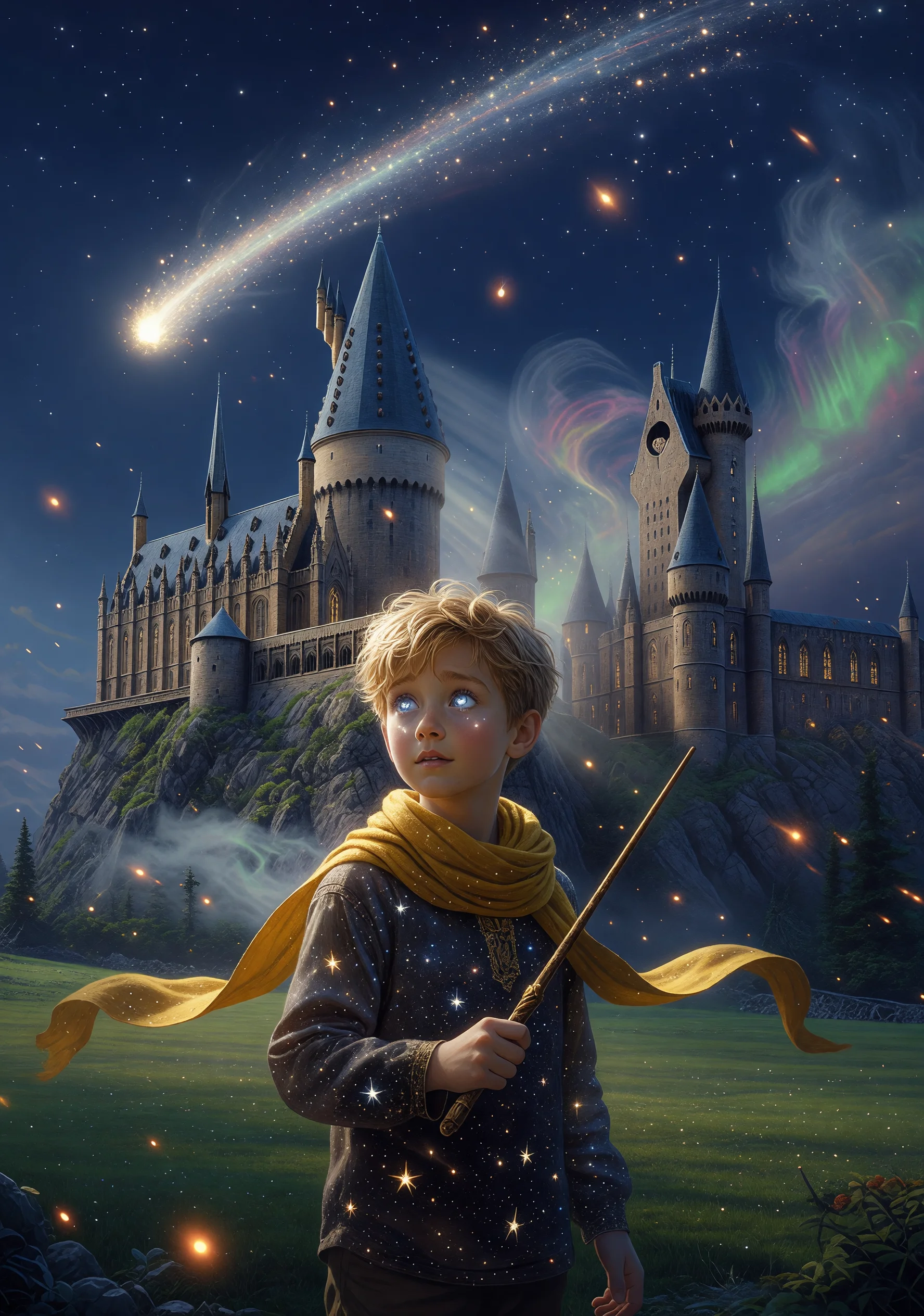 Lorsqu'une comète traverse le ciel de Poudlard par une nuit de novembre, personne ne s'attend à ce qu'elle dépose un visiteur sur la pelouse du château. Le Petit Prince, venu de l'astéroïde B-612, atterrit dans le monde des sorciers avec ses cheveux dorés, son cache-nez jaune et une question innocente sur les lèvres : « À quoi sert exactement une baguette magique, si l'on ne peut pas apprivoiser quelqu'un avec ? » Dumbledore, intrigué par cet enfant qui semble imperméable à toute magie conventionnelle, décide de l'accueillir à Poudlard en qualité d'élève extraordinaire. Le Chapeau du Choixpeau, décontenancé pour la première fois de son existence, murmure simplement : « Gryffondor, car son cœur est plus grand que n'importe quel sortilège. » Le Prince croise Harry Potter, Ron et Hermione en pleine enquête sur une mystérieuse disparition de pierre philosophale. Là où les trois amis cherchent des formules complexes et des preuves magiques, le Prince pose une fleur sur le seuil d'une porte et attend que la vérité vienne d'elle-même. Il désarme Rogue avec une question sincère sur sa tristesse cachée, déroute Voldemort en refusant de le craindre, et enseigne à Hermione que certaines réponses n'existent dans aucun livre. Sa présence révèle une vérité que les sorciers les plus puissants avaient oubliée : la magie véritable ne réside ni dans les mots latins ni dans les baguettes de bois, mais dans la capacité à voir ce qui est essentiel et invisible aux yeux. Pourtant, le Prince porte en lui la mélancolie de sa rose abandonnée sur B-612, et chaque étoile de ciel anglais lui rappelle qu'il devra bientôt choisir entre deux mondes qui ont besoin de lui.