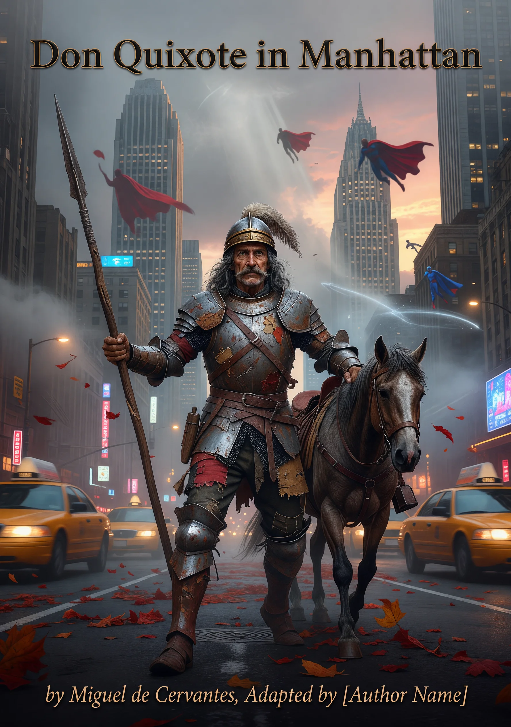 Alonso Quixano, un hidalgo manchego de mediana edad cuya mente ha sido moldeada por siglos de romances caballerescos, despierta un día en el corazón de Manhattan con su oxidada armadura, su lanza desvencijada y su fiel rocín. Nueva York no es ningún castillo encantado, sino un mundo de rascacielos, automóviles y superhéroes capaces de mover montañas. Sin embargo, Don Quixote —pues así exige ser llamado— no ve caos moderno, sino un nuevo campo de batallas donde los caballeros visten capas y los dragones llegan desde el espacio exterior. La Torre de los Vengadores se convierte en su castillo más preciado, y en sus pasillos conoce a Carol Danvers, la Capitana Marvel, cuya luz dorada le recuerda a la más noble de las damas caballerescas. Carol, pragmática y curtida en mil guerras estelares, lo recibe con mezcla de incredulidad y ternura creciente. La fe ciega del viejo hidalgo, su honor sin fisuras y su capacidad para ver grandeza donde otros sólo ven locura, despiertan en ella algo que ninguna batalla cósmica había logrado. Junto a Sancho Panza —su fiel escudero campesino que también atravesó el portal, prometido esta vez no de una ínsula sino de un apartamento en Brooklyn— Don Quixote se une a los Vengadores con cero poderes y una determinación inquebrantable. Su conocimiento de la honra, la estrategia medieval y la literatura clásica resulta, sorprendentemente, decisivo en momentos donde la fuerza bruta fracasa. Cuando Thanos amenaza con el guante del infinito, es la fe de un loco manchego lo que inclina la balanza. La novela entrelaza comedia cervantina con acción de superhéroes, explorando cómo el idealismo más anticuado puede iluminar el mundo más tecnológico, y cómo el amor verdadero no entiende de épocas ni universos.