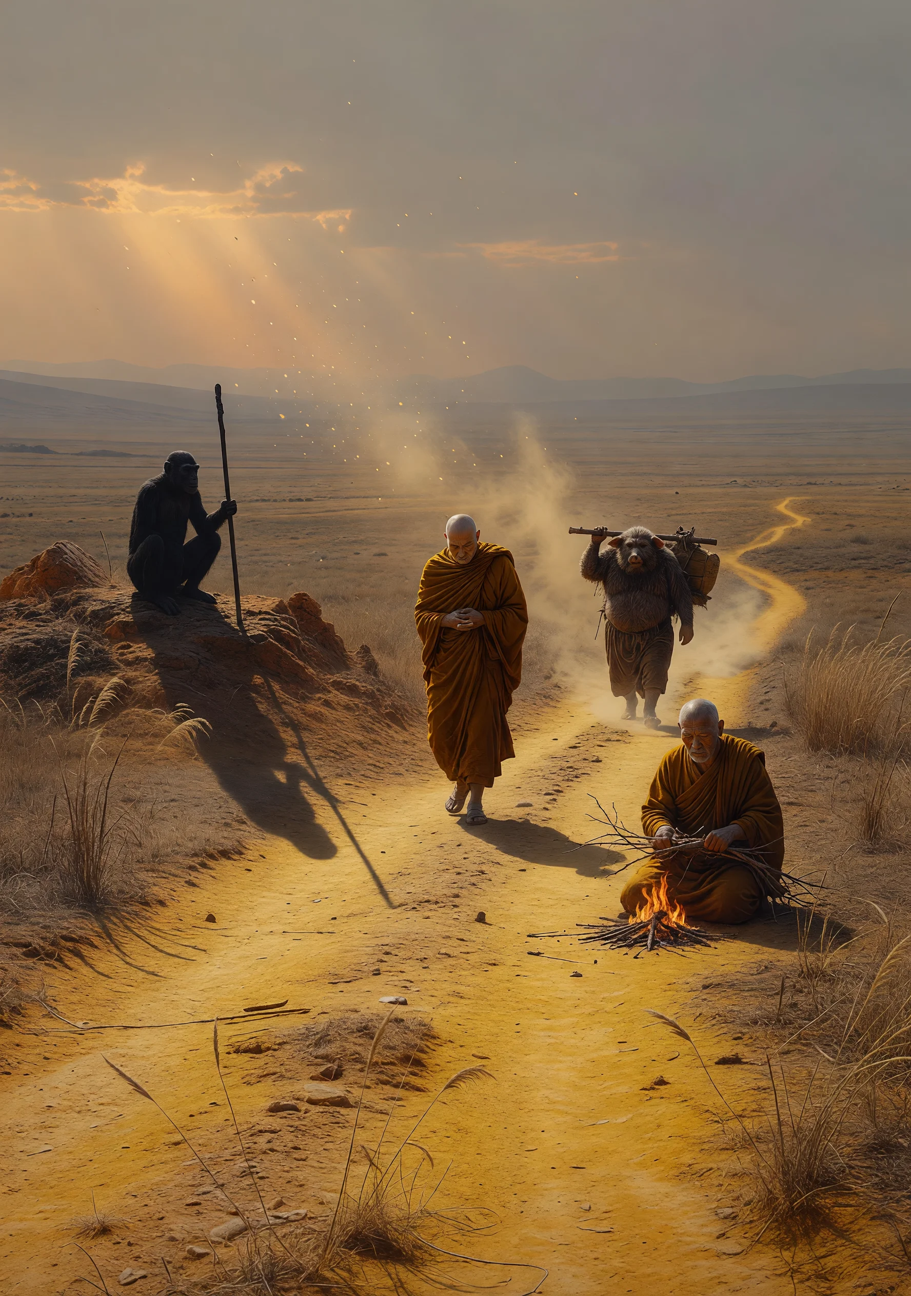 取經之路從未是一條英雄的路。唐僧、悟空、八戒、沙僧——四個被命運棄置在同一條荒路上的人,彼此之間說不清是信任還是將就。故事沒有妖魔,或者說,妖魔只是遠景裡一團模糊的煙塵,真正填滿畫面的,是曠野裡無言的趕路,是炊煙升起時誰也不開口的夜晚,是一塊石頭、一條河、一片在風裡抖動的蘆葦。悟空在山頂坐著,看不見他的臉,只有他的影子落在黃土上;八戒挑著擔走在最後,腳步聲在空谷裡回響,比任何話都沉;沙僧把木柴一根根折斷,火光照著他,他沒有表情。唐僧偶爾念幾句經,聲音細得像是說給自己聽。四個人不是師徒,更像是在同一條路上相遇、又沒有理由分開的陌生人。西天從不是目的地,只是一個讓他們繼續走下去的理由。這部小說借取經之殼,寫的是人在漫長旅途中如何與自身的孤獨相處,如何在沉默裡辨認彼此,如何讓一段沒有終點感的旅程,成為生命本身的形狀。