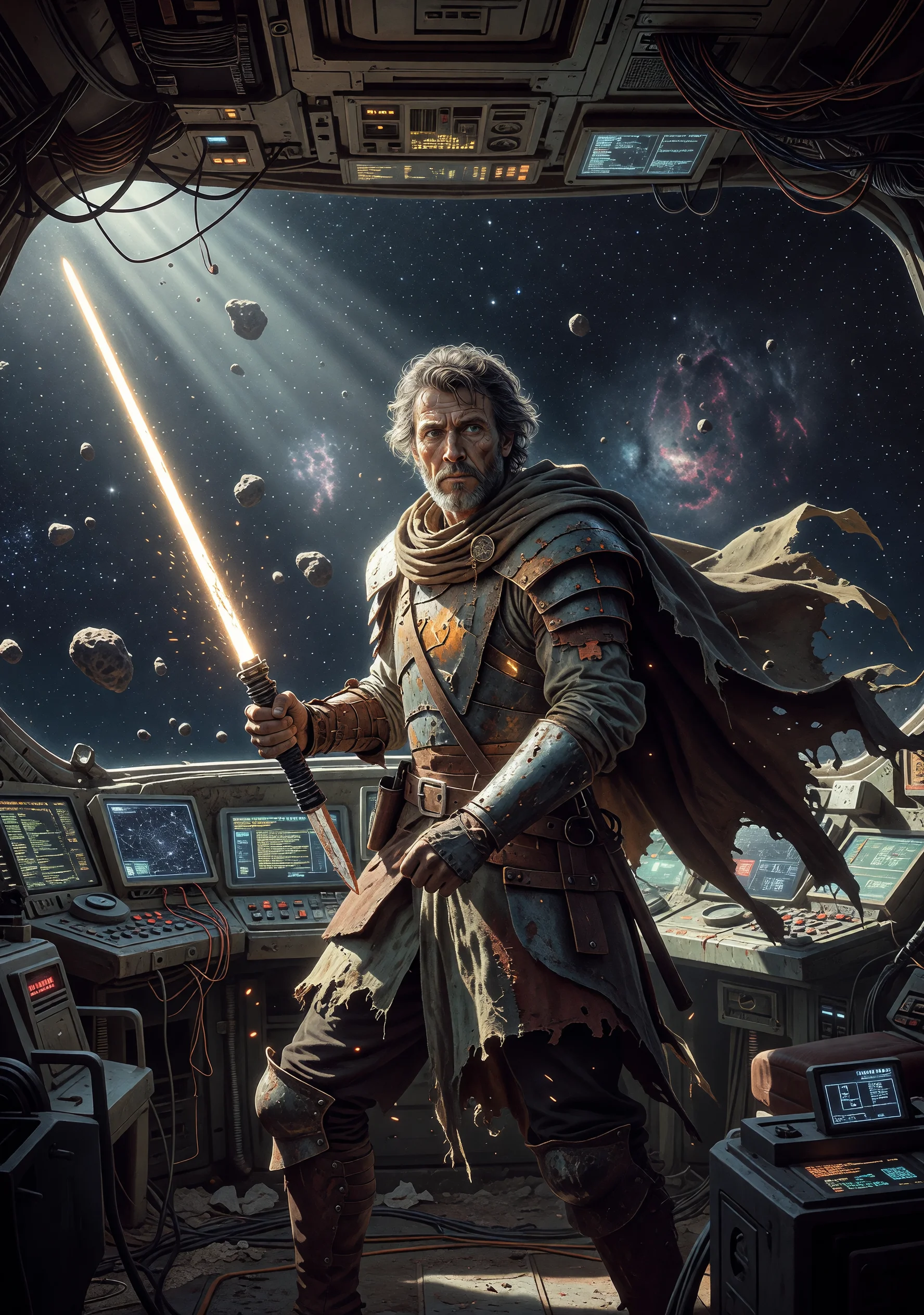 En los confines del Sector Olvidado, donde la República Galáctica no es más que un rumor polvoriento y los Jedi una leyenda de borrachos, vive Alonso Estelquijano, un hidalgo de mediana edad que ha consumido su cordura leyendo antiguos holocrones sobre los Caballeros de la Fuerza. Convencido de que la galaxia clama por un héroe, se bautiza a sí mismo Don Quixote de la Galaxia, se enfunda en una armadura de duralacero oxidado, y declara que su desvencijada nave de carga —la Rocinante Estelar— es un crucero de combate digno de las leyendas. Acompañado de su escudero Sancho Panzabelly, un rollizo contrabandista de asteroides al que promete el gobierno de una luna entera, Don Quixote parte a restaurar el orden de la Fuerza en una galaxia que hace siglos dejó de creerle. Sus aventuras lo llevan a confundir estaciones espaciales con gigantescos molinos enemigos, a liberar prisioneros de una nave de la Federación Comercial que luego lo atacan con sus propios torpedos, y a toparse con senadores corruptos, reinas disfrazadas de doncellas, y un misterioso Señor Oscuro que mueve los hilos del caos desde las sombras. Mientras el Canciller Valerón se desmorona políticamente y la Federación avanza sobre mundos indefensos, solo un loco con una espada de luz robada —que en realidad es un tubo fluorescente— se atreve a gritar que la Fuerza aún existe. La novela explora la colisión entre idealismo delirante y realidad despiadada, la corrupción de las instituciones galácticas, y la pregunta que nadie se atreve a responder: ¿acaso la locura de un hombre es la única forma de heroísmo que le queda a un universo que ha olvidado ser bueno?