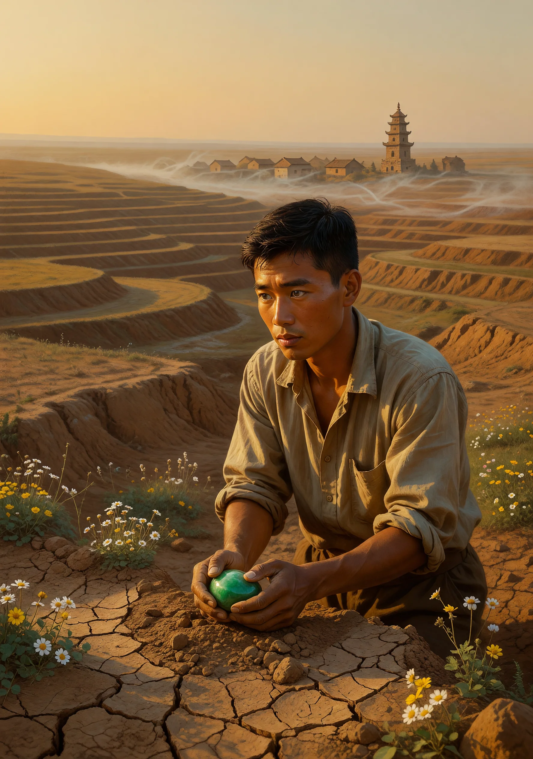 20世纪70年代末,陕北黄土高原上的苦水沟村,贾宝生含着一块温润异常的鹅卵石降世,老父贾政厚视之为祖传风水石,压在炕头供奉。宝生自幼生得眉清目秀,偏不爱锄地犁田,独喜跟村里婆姨女子厮混说话,帮人梳辫子绣花样,被父亲斥为没出息的软骨头。他与表姐林黛秀青梅竹马,两小无猜,林黛秀体弱多病却识文断字,是十里八村最有灵气的女孩。宝生在县城高中求学,结识了干部子弟薛宝珍——这个城里来的姑娘端庄大方,家中托人撮合两人亲事。改革开放的春风吹进沟壑纵横的山村,大队土地开始分包到户,宝生的父亲逼他扛起门户,娶一门好亲、盖几孔新窑。宝生却带着那块祖传石头独自跑去省城,在建筑工地揽工,用一手好字给工友写家书,在夜校教识字班,在街边给人写诉状。他走遍城乡,所见皆是时代洪流中挣扎求存的普通人——进城谋生的农村女子、被政策压弯了腰的老支书、怀揣理想却前途未定的青年教师。林黛秀在一个风雪夜病逝,宝生扑回黄土地,在她坟前将那块传家石埋入土中。从此他俯下身去,真正学会了用双手刨开黄土,在平凡的世界里寻找属于自己的根与魂。
