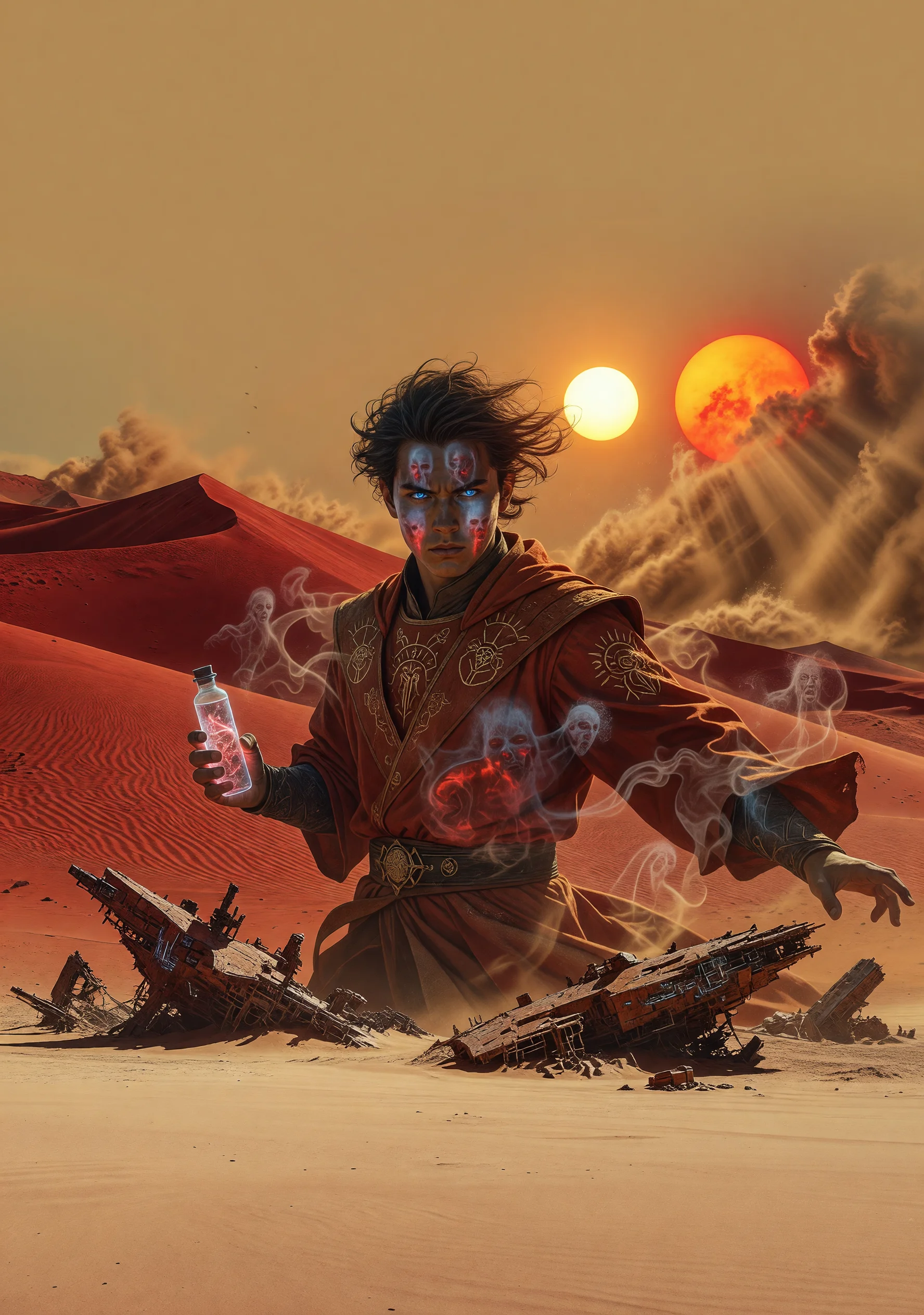 In the far future, the desert planet Verath is the only source of Solis — a substance so precious that empires have bled for a single grain. But Solis is no ordinary drug. It does not show you glory or destiny. It shows you death. Every possible death. All of them yours. Kael Ostren is seventeen years old when his family, the noble House Ostren, is given dominion over Verath by a distant and suspicious Emperor. His father, Duke Maren Ostren, believes it is an honor. Kael knows, in the marrow of his bones, that it is a trap. Within weeks of their arrival, the Duke is betrayed by agents of the rival House Vael — men who smile at dinner and slip poison into goblets — and Kael watches his father die on a marble floor far from home. Kael and his mother Sera flee into the open desert, where the native Ashri people survive by ritual, silence, and an almost religious relationship with the massive sand-boring creatures called the Devoirns. The Ashri take them in, warily. Kael, who has been secretly consuming raw Solis to sharpen his mind, begins to fracture. The visions come in cascades: a thousand deaths, each vivid, each intimate. He drowns. He burns. He is shot through the throat during a charge he has not yet ordered. He begins to distrust every action he takes because each one branches into new dying. He stops sleeping. He stops eating. He begins to wonder whether he is a prophet or simply a boy going mad in the heat. The Ashri whisper that he is the Ashkavar — the one who sees the shape of the end and walks into it anyway. Kael is not sure he wants to be saved. He is not sure there is anything left of him worth saving. But House Vael is coming, and the Emperor is watching, and the dunes do not care about doubt.