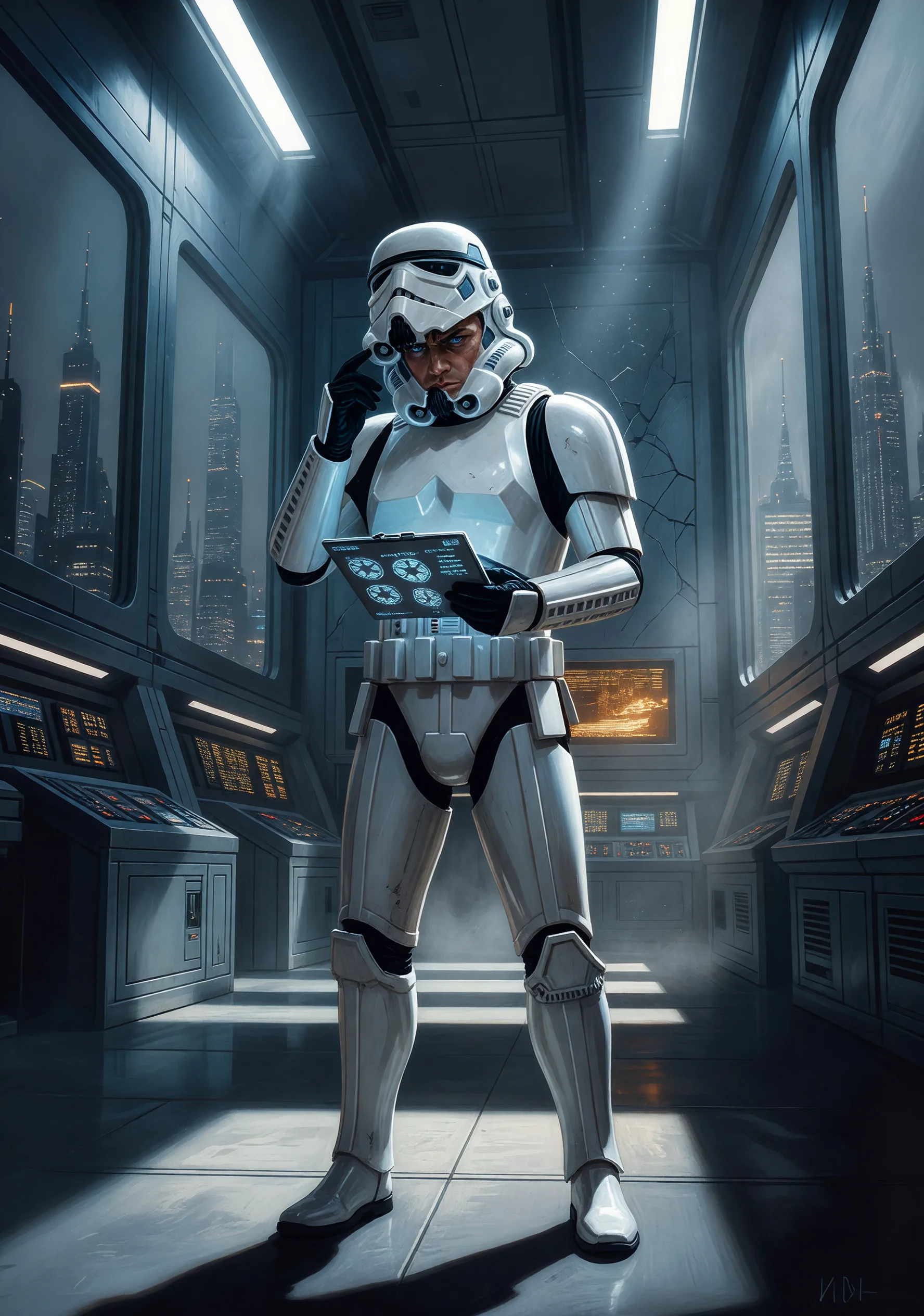 In the gleaming corridors of Coruscant's Imperial Administrative District, Trooper Designation KL-7749 — known informally as Kael among his barracks brothers — has spent eleven years believing every word etched into the Imperial Loyalty Codex. The Empire is order. Order is survival. Survival is love of the Emperor. But when Kael is reassigned to the Propaganda Verification Bureau, tasked with cross-referencing civilian testimony against official Imperial broadcasts, he begins to notice the gaps — small at first, like hairline fractures in durasteel. A senator's speech altered after the fact. Casualty figures that do not correspond to the bodies he personally carried. A woman, a low-level civil archivist named Sera Dohn, who slips him a folded data chip in the medical corridor after a training injury, her eyes wide with something that resembles less defiance than exhaustion. Kael does not open the chip for nine days. When he finally does, what he finds is not a rebel manifesto. It is only a list of names — people who existed, then were made not to exist. His own father's designation among them. The novel follows Kael's internal disintegration as the machinery of the Empire continues turning around him, indifferent and immaculate. There are no grand rebellions. There is no escape. There is only the slow, suffocating recognition that he has been the instrument of the very erasure he is now trying to comprehend. His commanding officer, Director Ossian Vreth, may already know. The telescreen panels in the barracks never sleep. And the Empire does not punish doubt — it simply waits for doubt to finish the work itself.